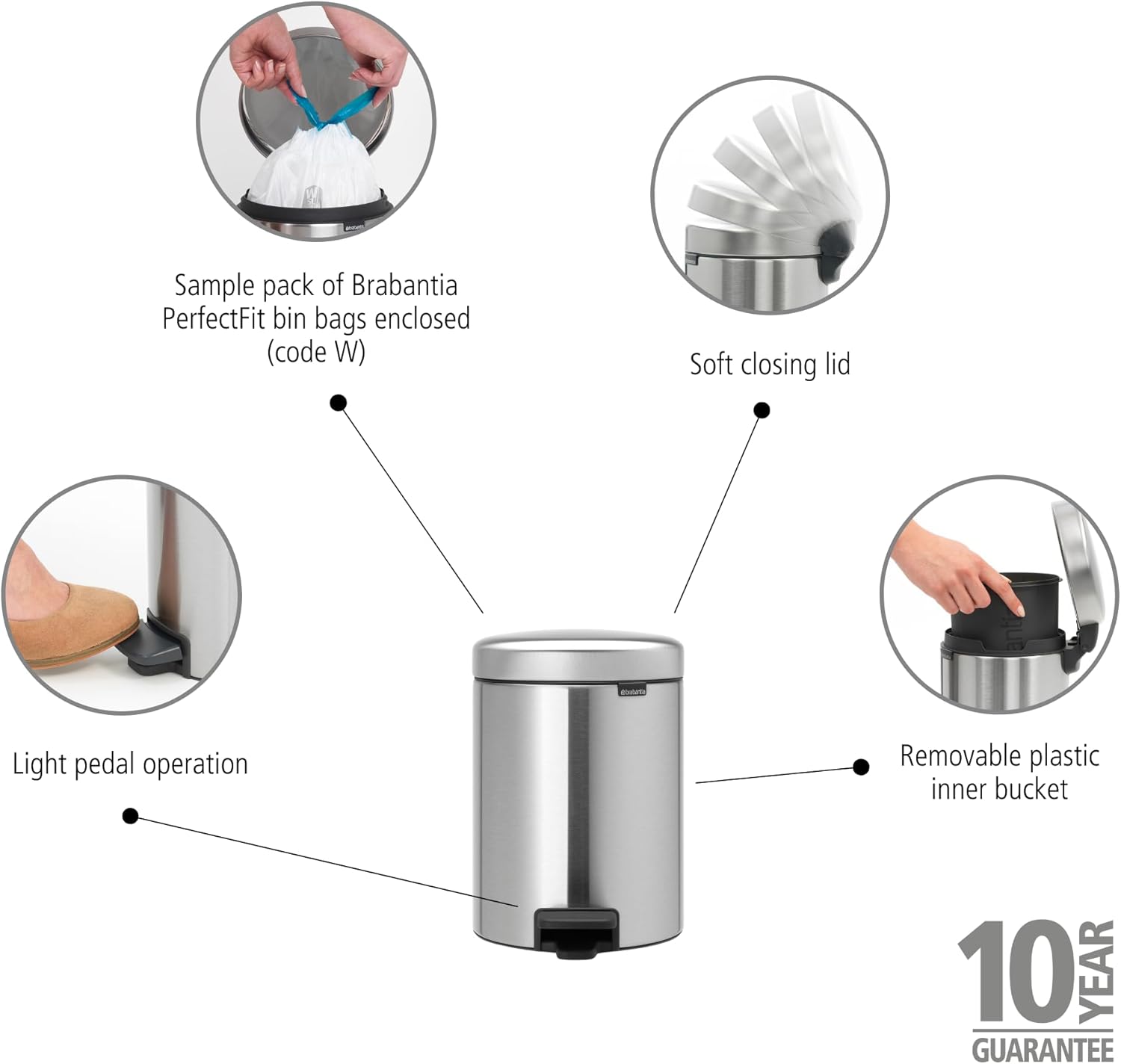 - Abnehmbare innere Eimer mit passendem Grösse Brabantia Müllbeutel erhältlich