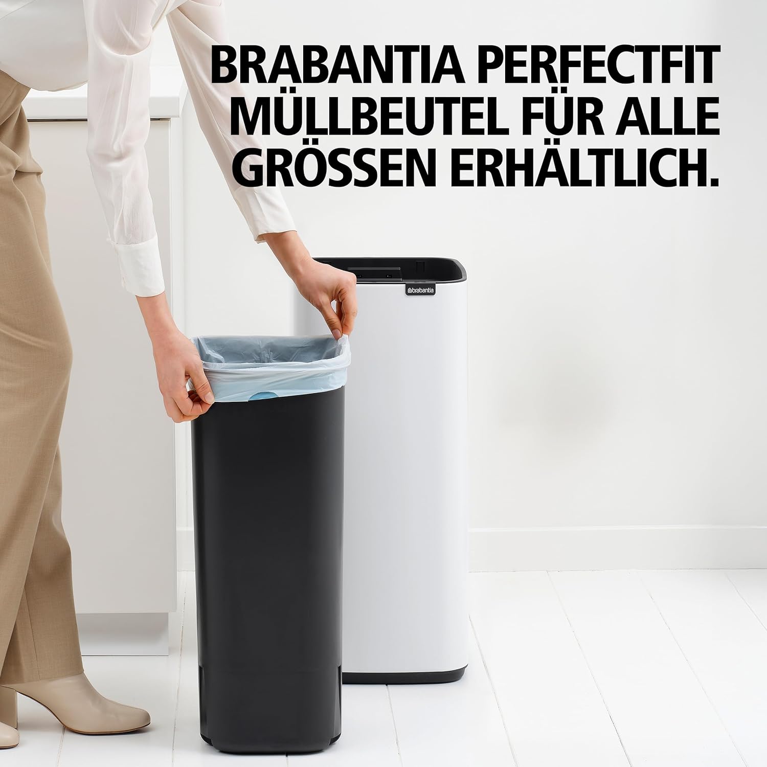 - Soft-Touch-Öffnungssystem – Der Brabantia Abfallsammler öffnet sich mit einer sanften Berührung der Hand, was eine mühelose Bedienung gewährleistet und das Wechseln der Müllbeutel vereinfacht