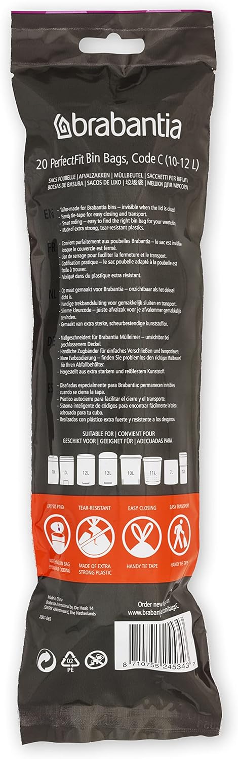 • Legen Sie einen Vorrat an – 10 Rollen mit 20 Müllbeuteln, die perfekt in Ihren 10- bis 12-Liter-Mülleimer von Brabantia (Code C) passen