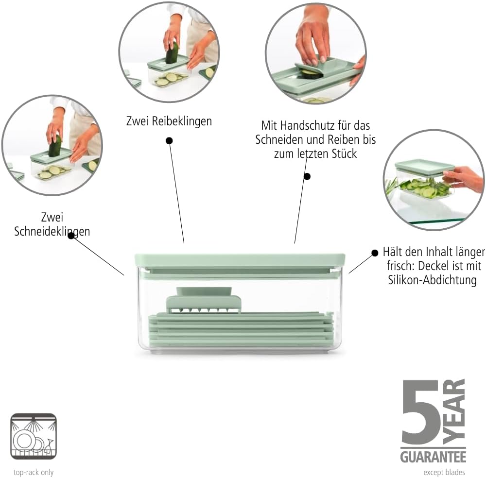 - Praktische Funktionalität - Reibe- und Schneideklingen lassen sich direkt im Behälter aufbewahren.