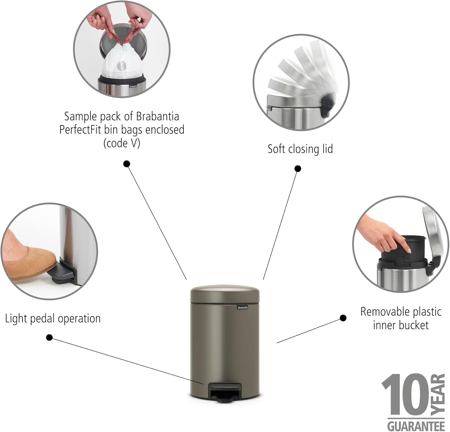 - Einfache Reinigung – herausnehmbarer Inneneinsatz. Inklusive Probepackung unserer Brabantia PerfectFit Müllbeutel (Code A) – einfache und unsichtbare Anbringung