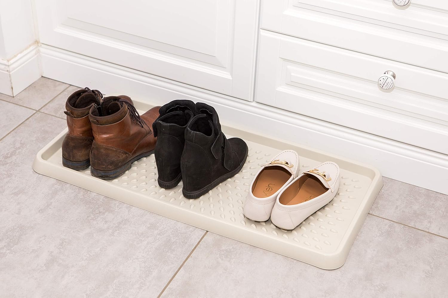 - Besonders im Herbst und Winter sind die Schuhe ideal auf der Schale aufgehoben: Der erhöhte Rand verhindert, dass Schmutz oder Feuchtigkeit von den Schuhen auf den Boden läuft - praktisch und platzsparend