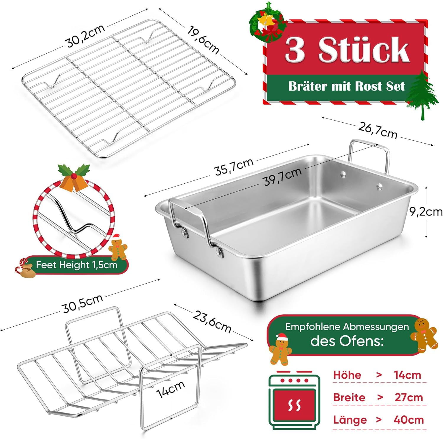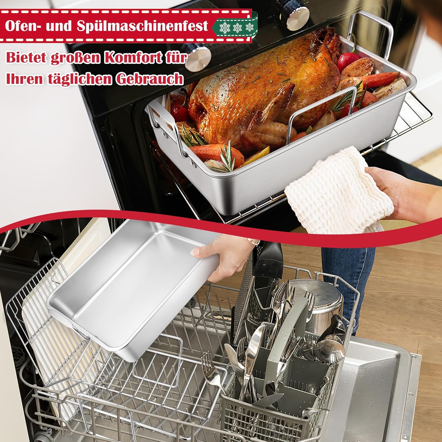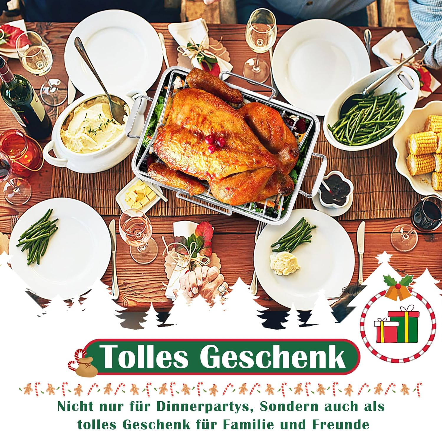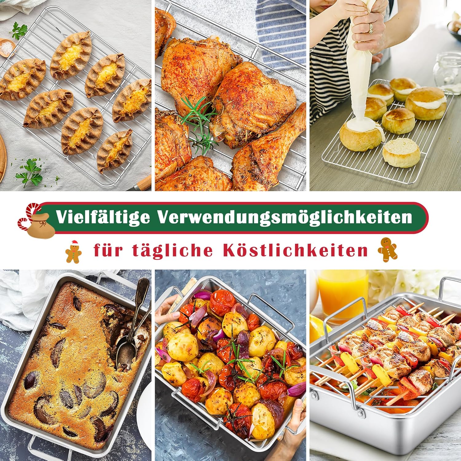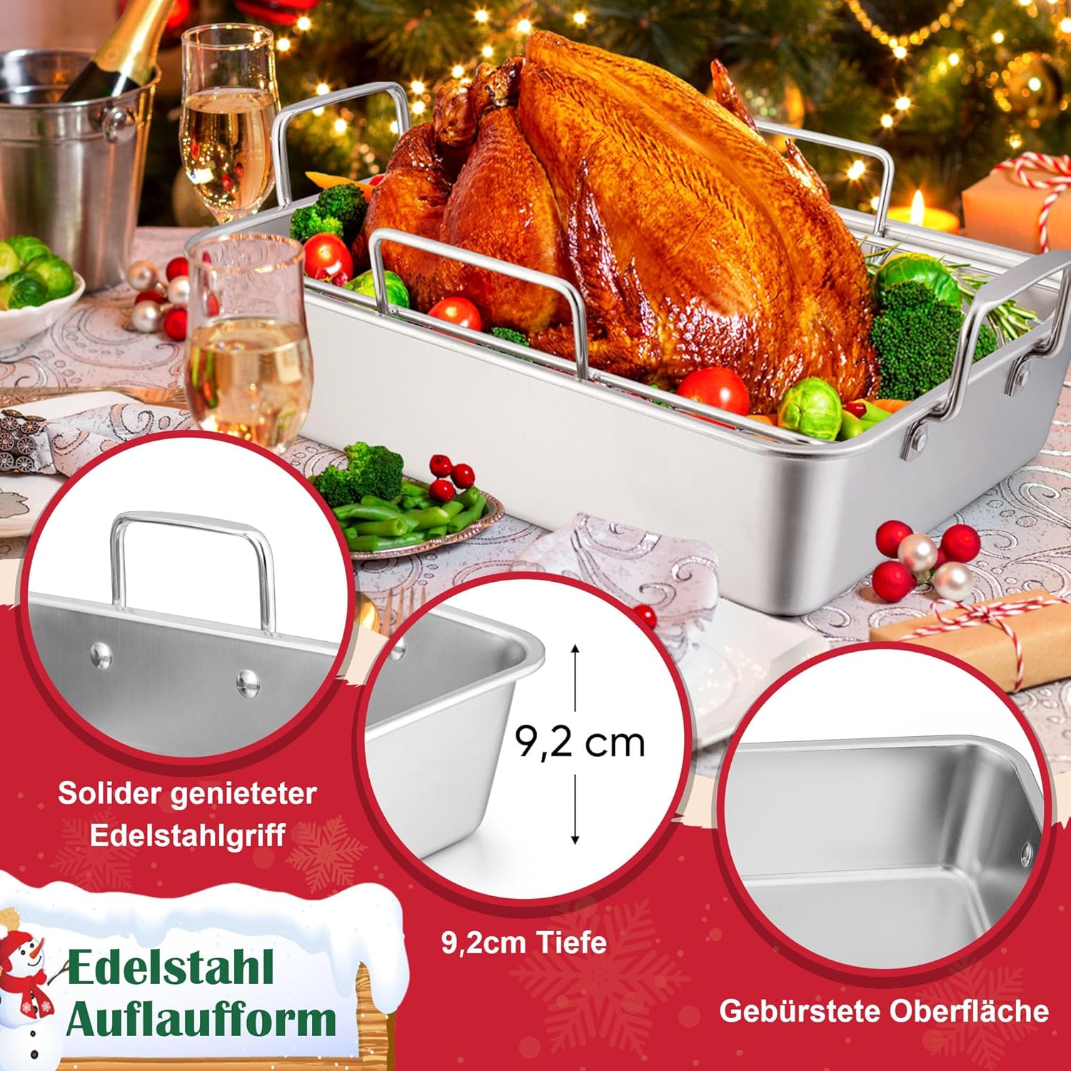 - 【Multifuktion】 Enthält 1X Auflaufform, 1X Abkühlgitter, 1X V-Form Gitterrost, Geeignet zum Braten von Truthähnen, Hähnchen und Rippchen, Auch zum Backen von Lasagne, Brownie, Gemüse, Aufläufen, Ein perfektes Geschenk für Weihnachten,