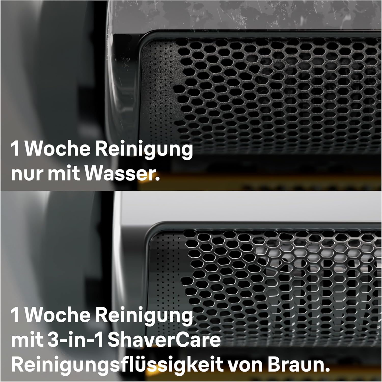 - Die Braun 3-in-1 ShaverCare Reinigungsflüssigkeit reinigt deinen Rasierer hygienisch, indem sie Haarreste und Hautpartikel entfernt