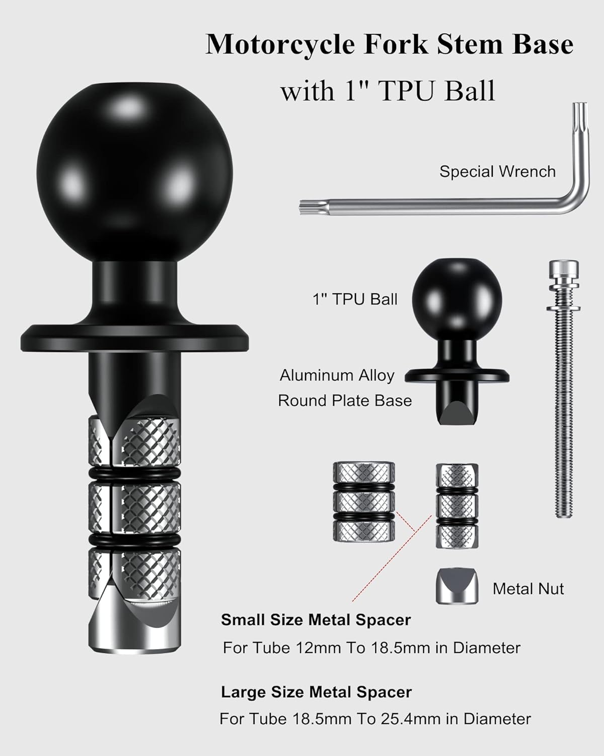 - ▶ EINFACHE INSTALLATION: Nachdem Sie den richtigen Abstandshalter ausgewählt und montiert haben, installieren Sie die Kugelbasis. Schritt 1, stecken Sie die Kugelbasis in das Motorradschaftrohr. Schritt 2, verwenden Sie den mitgelieferten