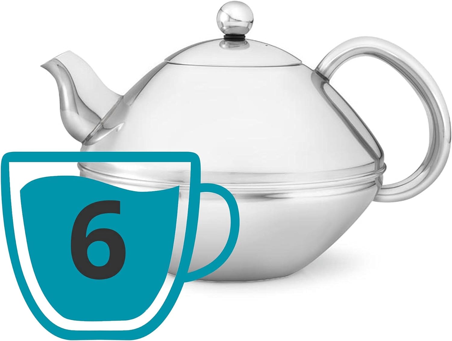 - Die flache rundliche silberne 1.4 L Teekanne aus Edelstahl ist doppelwandig und isoliert Tee optimal