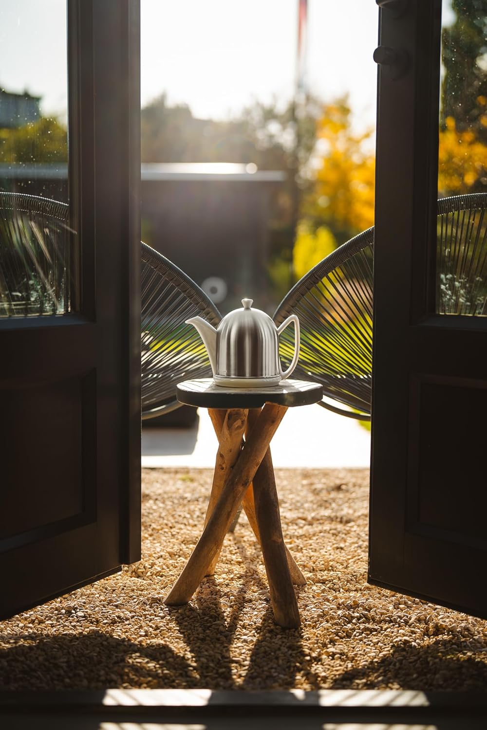 - Der weisse Griff & der Knopf der Steingut-Teekanne mit Edelstahlmantel werden einzig handwarm