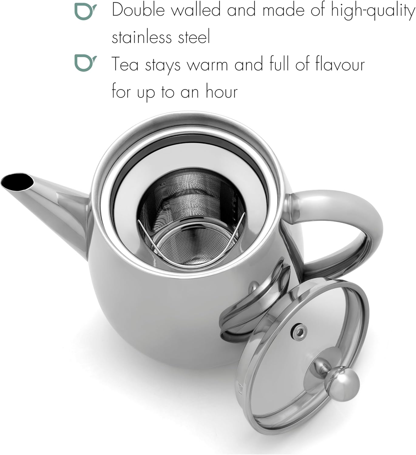 • Die kleine schlichte silberne 1.1L Teekanne aus Edelstahl ist doppelwandig und isoliert Tee optimal