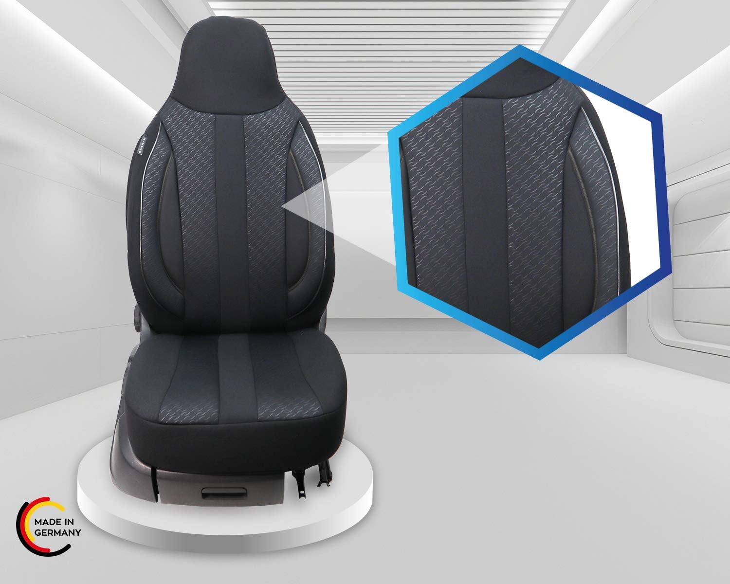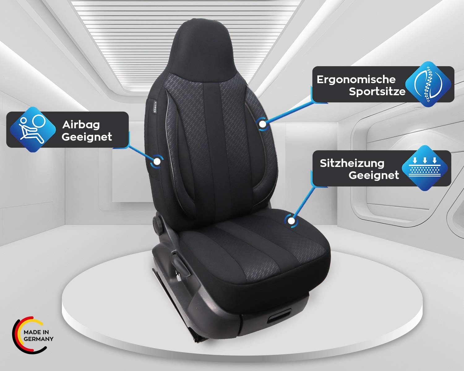 - Merkmale - Mass Anfertigung für Fahrer und Beifahrer, Passend auch für Aktivkopfstützen (nicht abnehmbare Kopfstützen), Fertigung Made in Germany