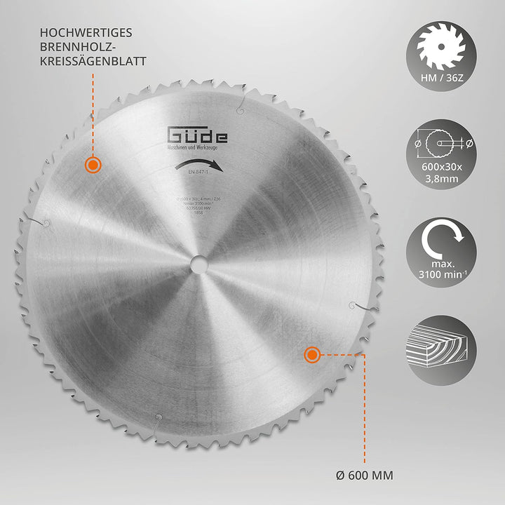 - HARTMETALL-QUALITÄT: Das Güde Brennholzsägeblatt HM 600x30x36Z ist aus hochwertigem Hartmetall gefertigt, was für Langlebigkeit und optimale Schnittergebnisse sorgt.