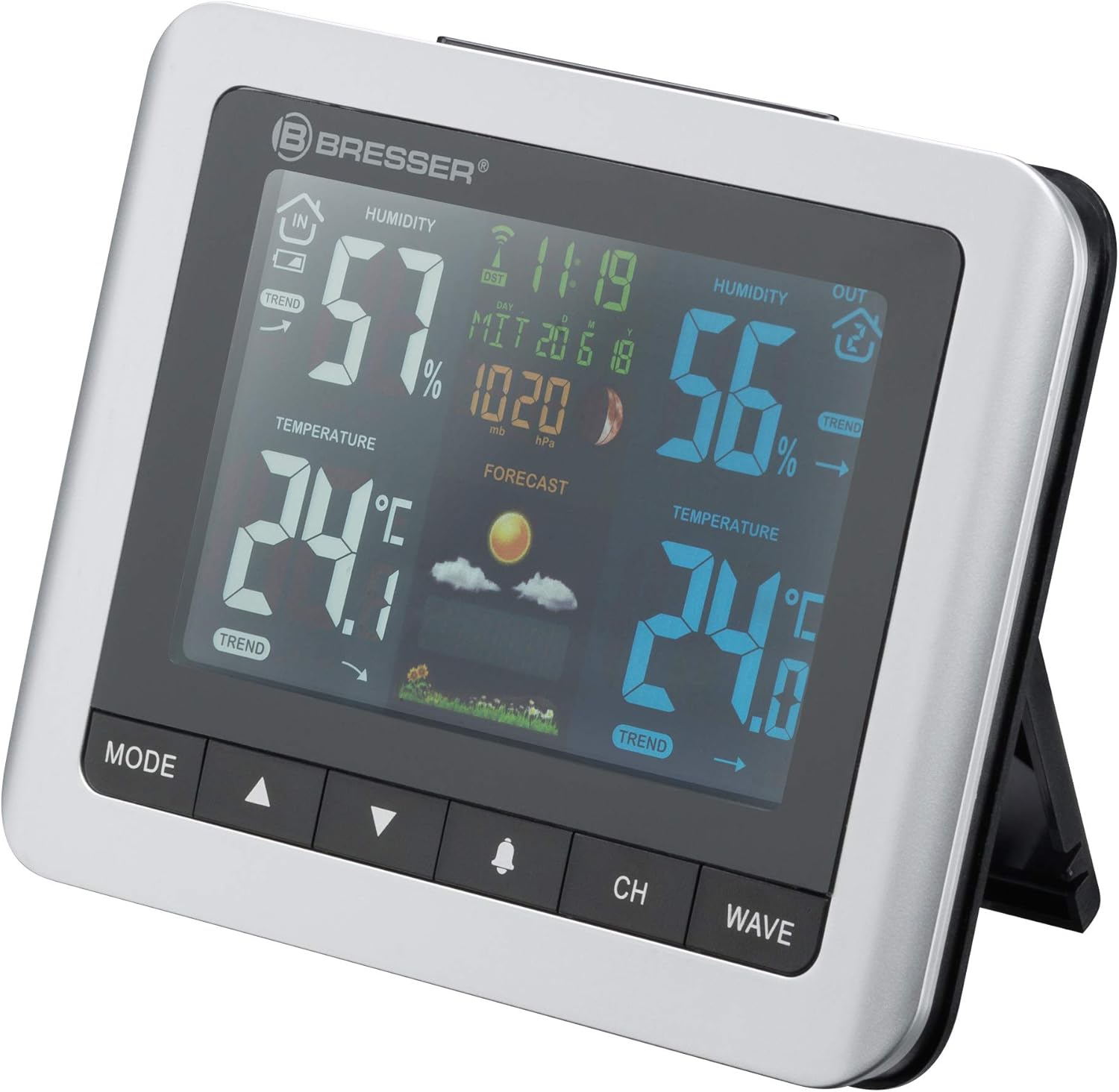 - Die Wetterstation mit mehrfarbigem Display enthält zahlreiche Informationen wie Temperatur, Luftfeuchtigkeit, Luftdruck und die verschiedenen Mondphasen