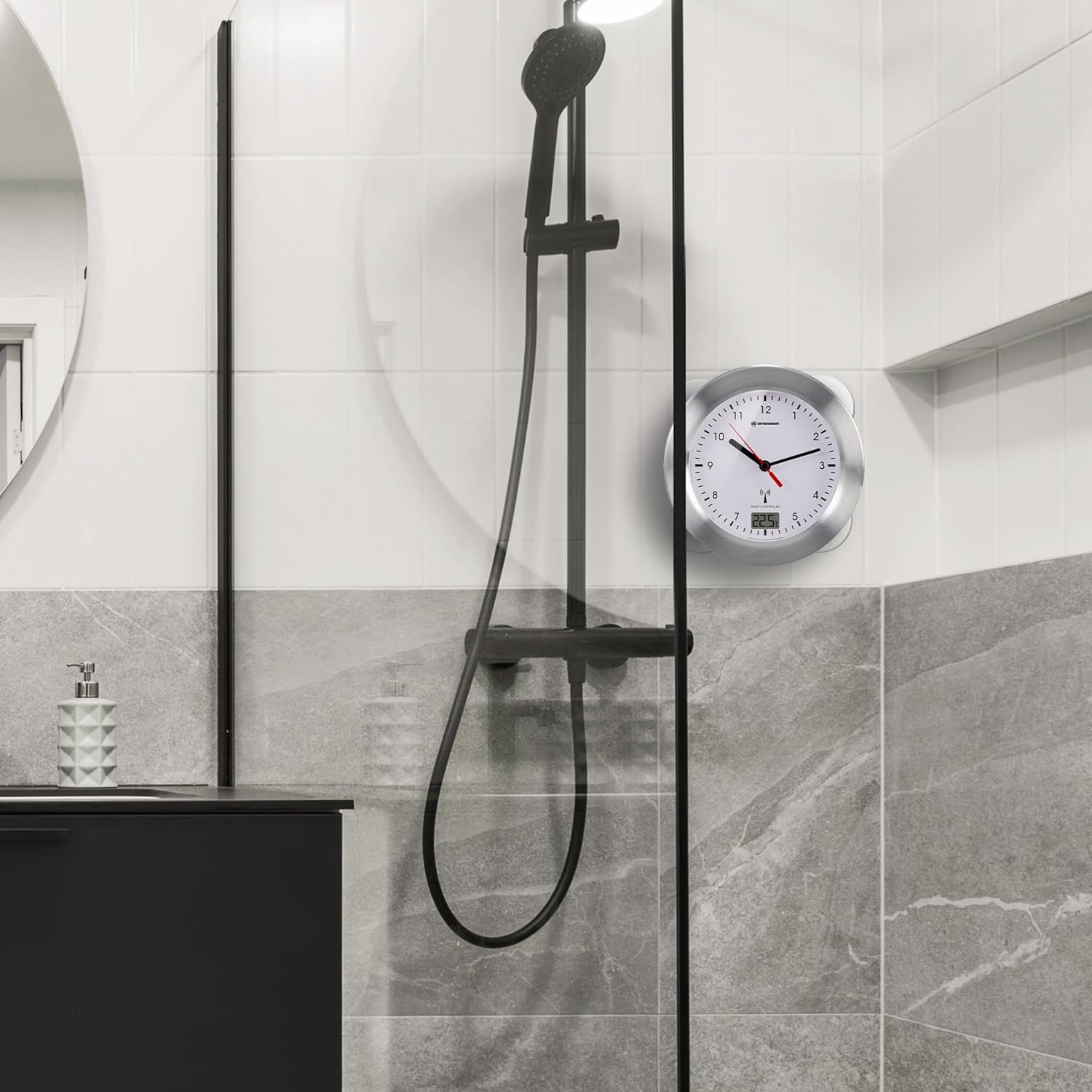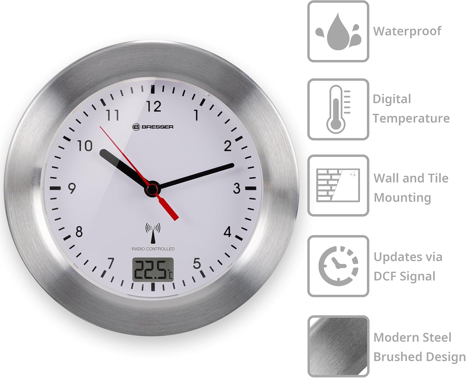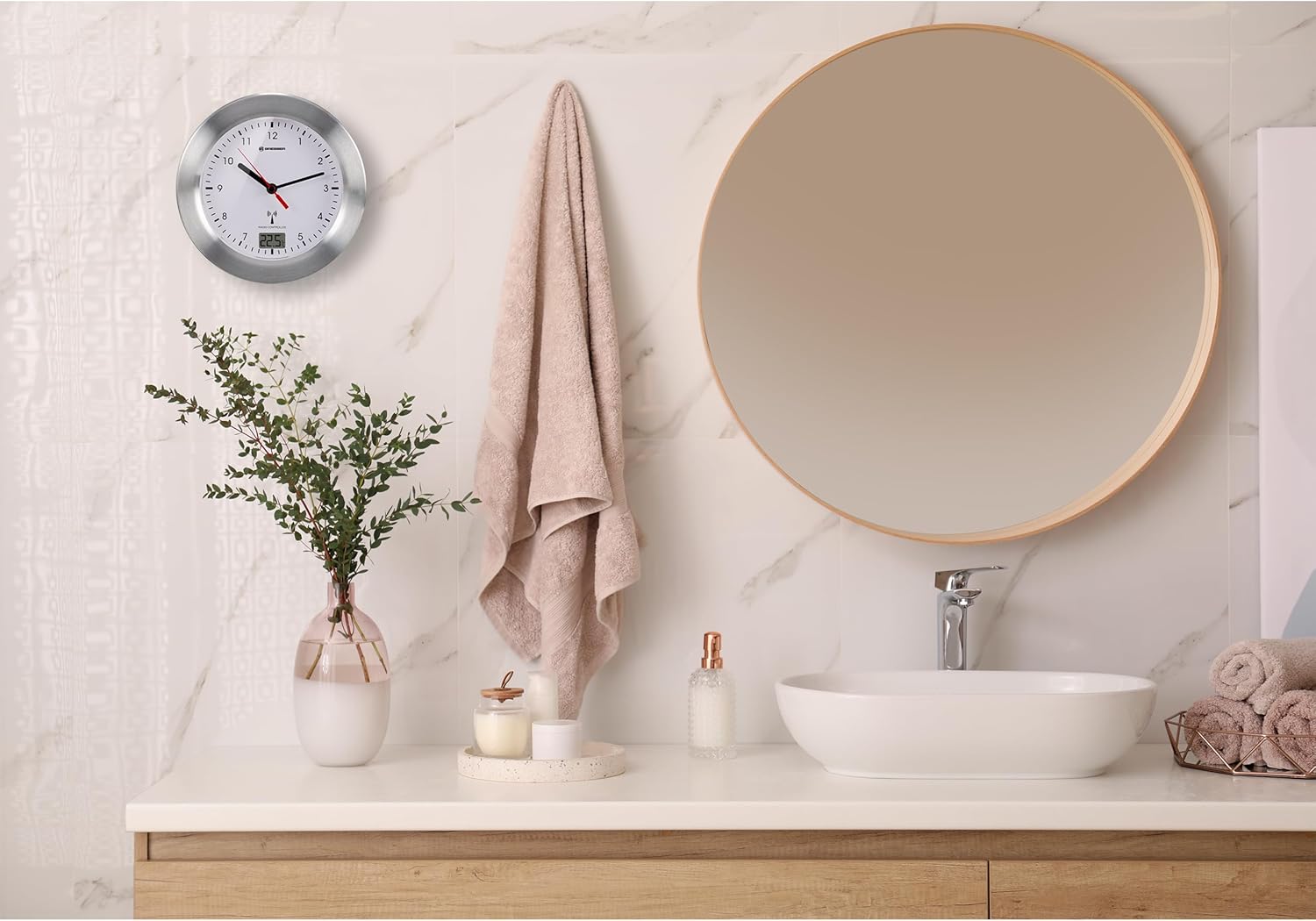 - Eine wasserdichte und analoge Wanduhr, welche durch ihr schlichtes und modernes Design besticht Neben der Zeit wird die Temperatur digital angezeigt