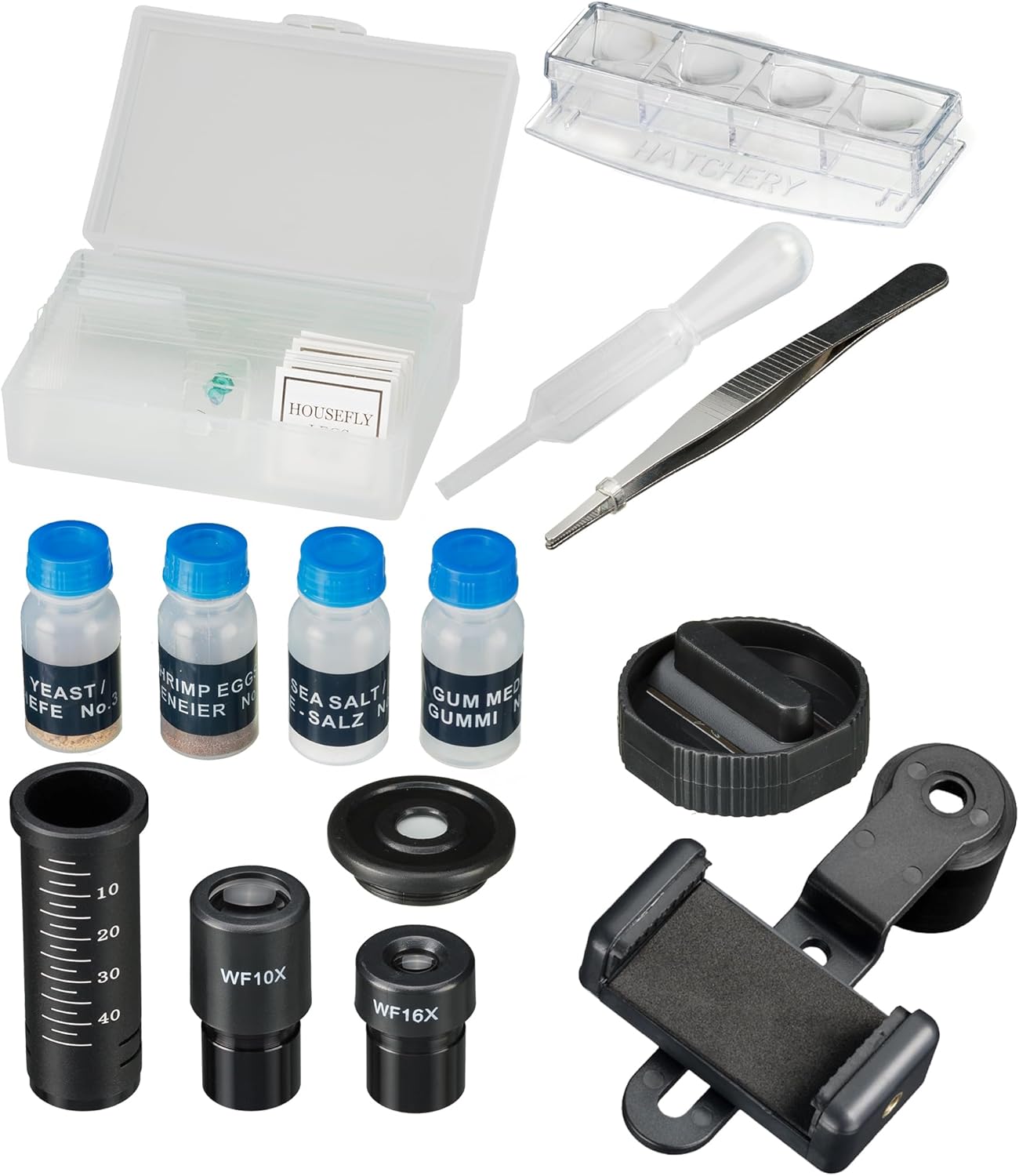 - Lieferumfang: Mikroskop, Koffer, 2 Weitfeld-Okulare: 10x und 20x, 3 Objektive: 4x, 10x und 40x, Barlow-Linse (2x), Mikroskopierbesteck, Hefe, Seesalz, Garneleneier, Garnelenbrutanlage, Microcut-Mikrotom, leere Objektträger und Deckgläser,