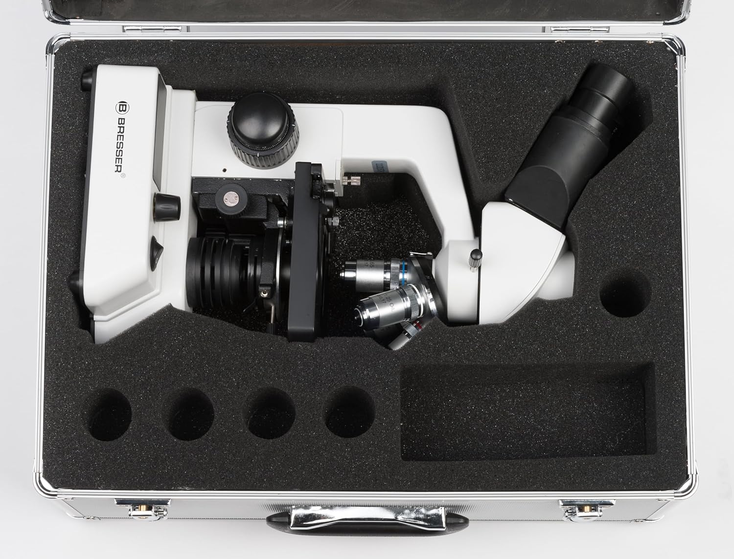 - Neben der Schaumstoffeinlage für das Mikroskop sind auch weitere Aussparungen für Zubehör wie Okulare, Objektive und Objektträger vorhanden.