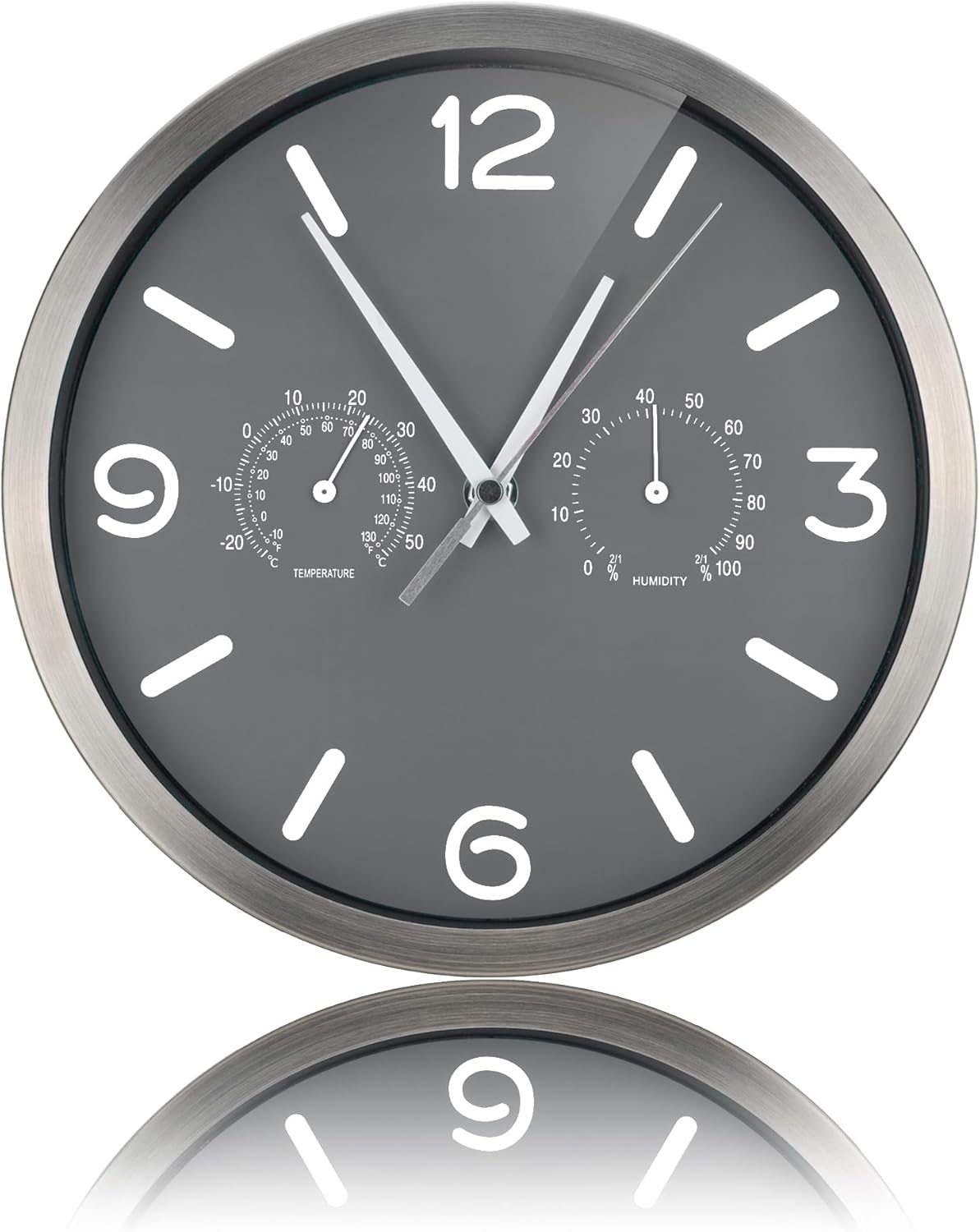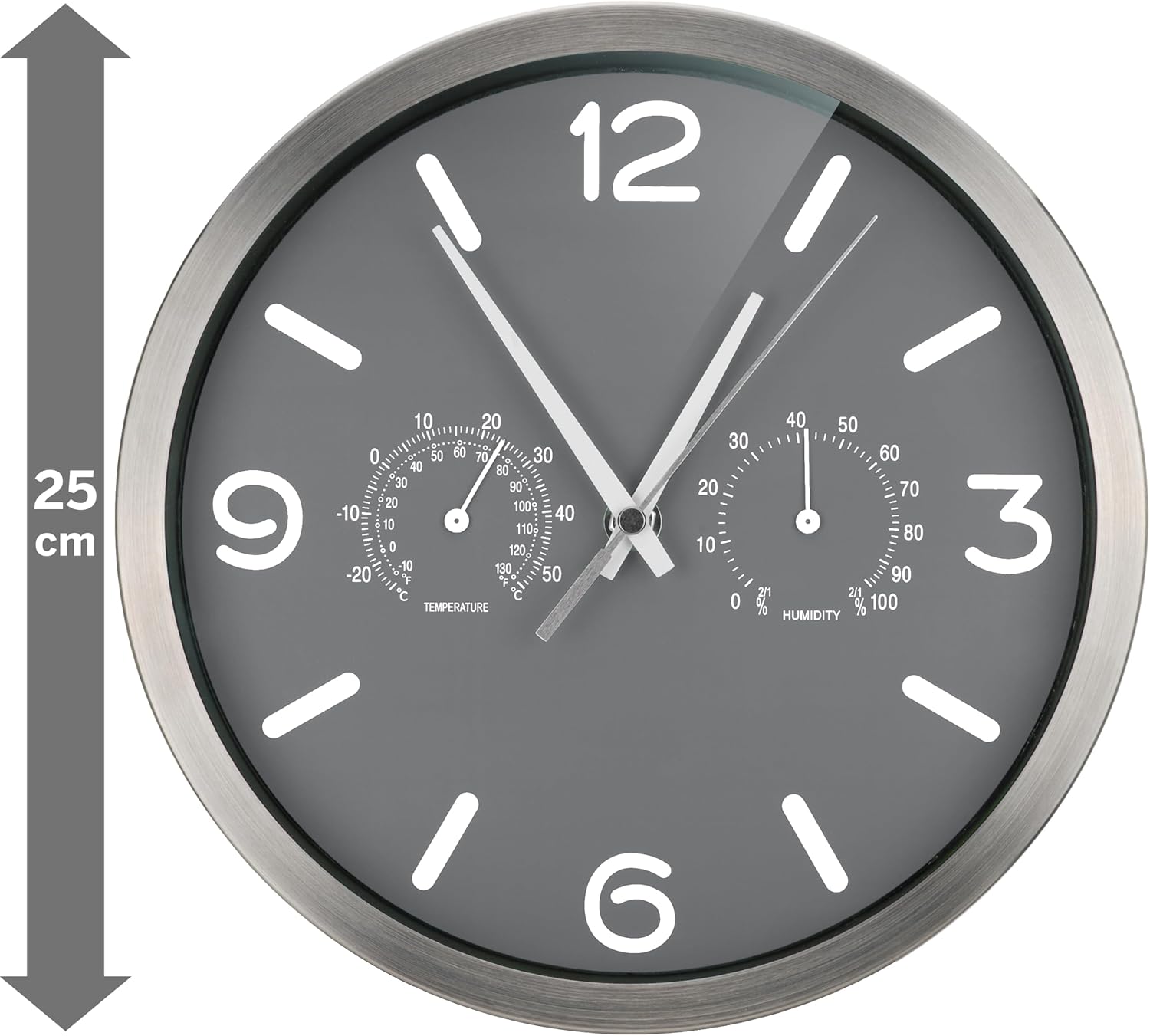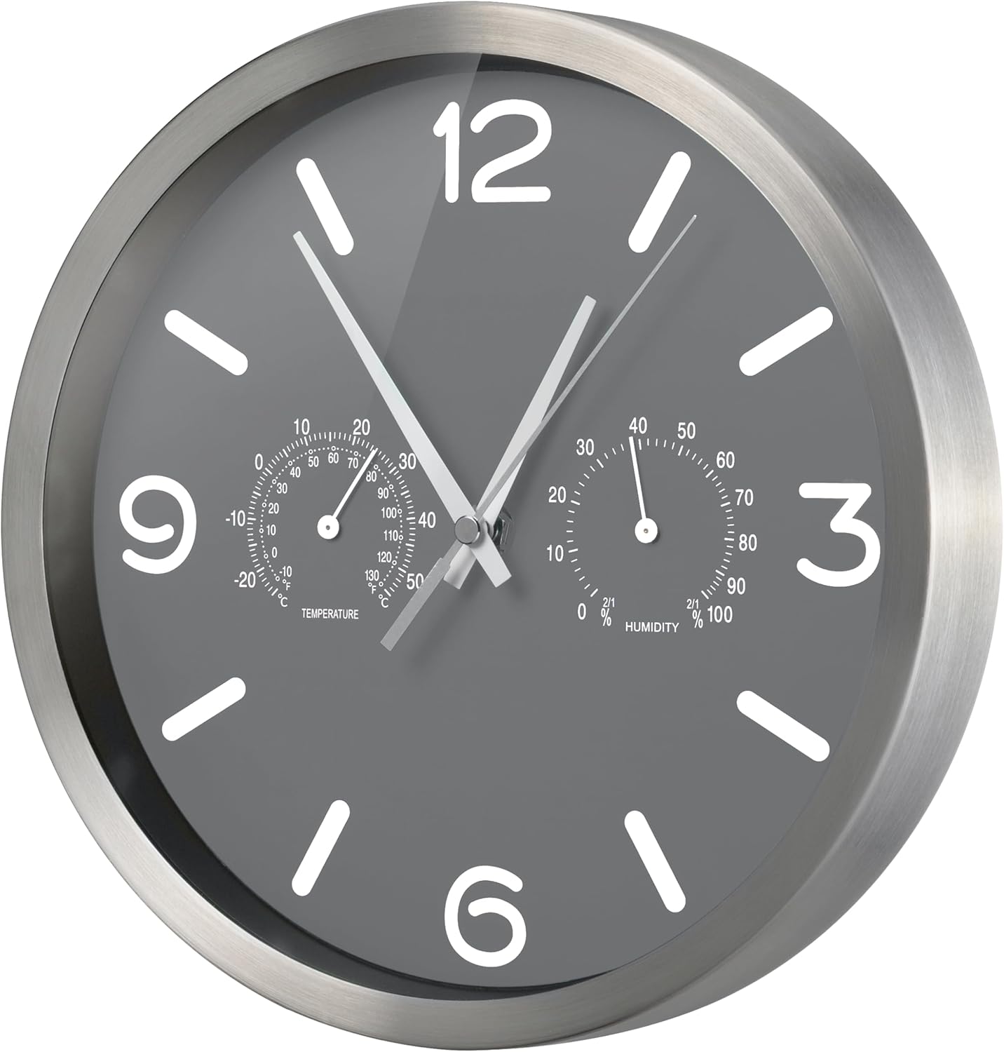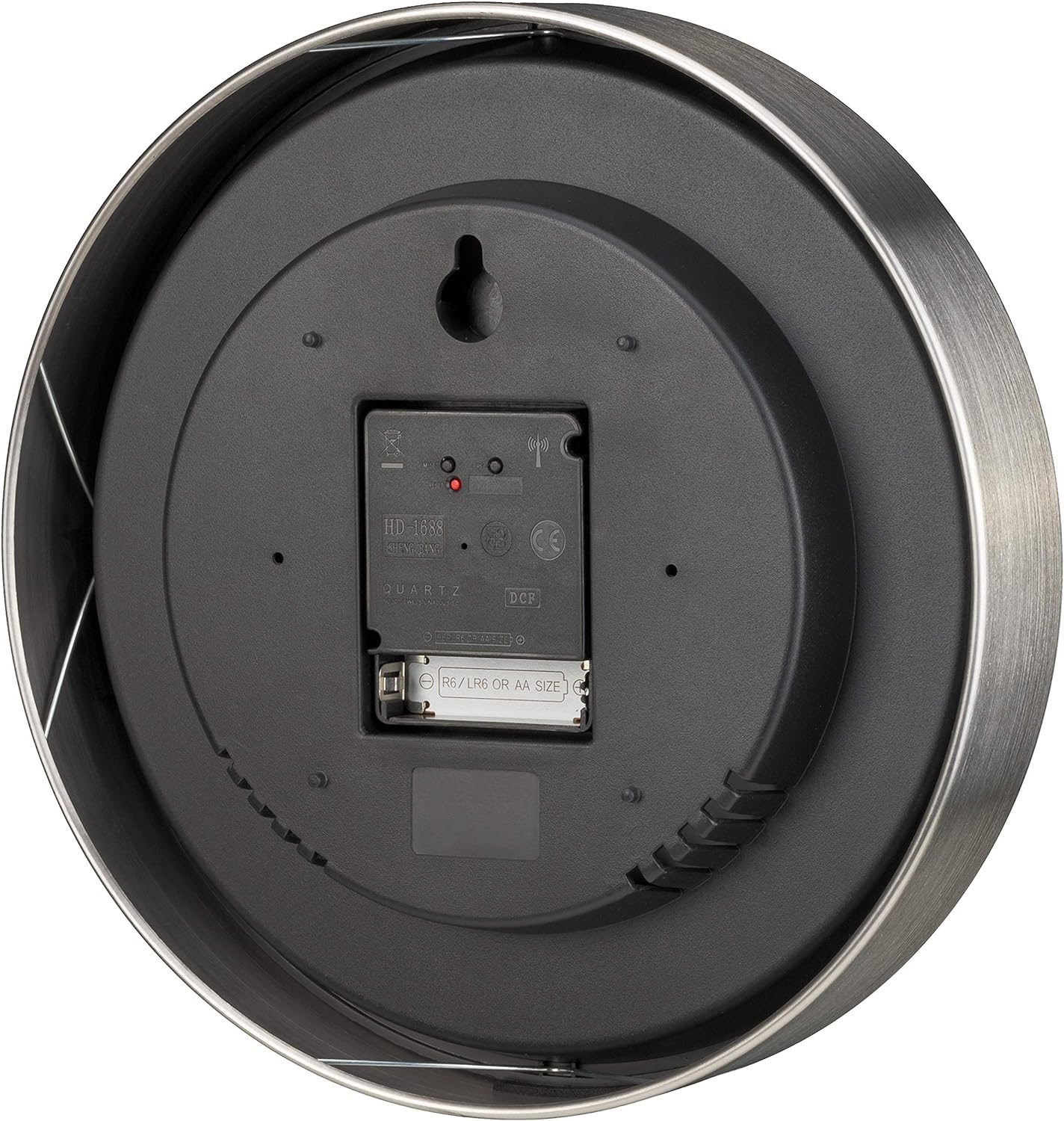 - Eine elegante Funkwanduhr mit integriertem Thermo und Hygrometer. Das übersichtliche Ziffernblatt wird von einem gebürsteten Edelstahlrahmen umschlossen