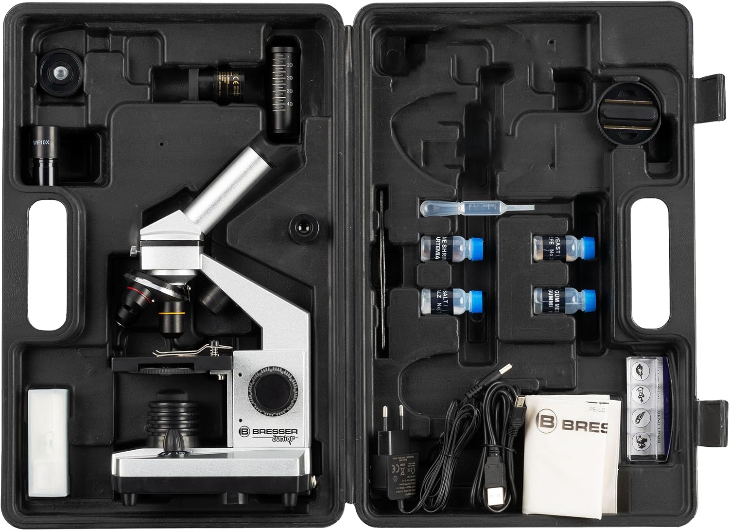 • Lieferumfang: Mikroskop; USB Okular; 5 Objektträger und 5 Deckgläser; Garnelenbrutanlage; Einschlussmittel; Weitfeldokulare; Hartschalenkoffer; Pipette, Pinzette, Mikrotom; Staubschutzhülle; Hefe, Seesalz, Garneleneier; Barlow-Linse; ,Netzteil