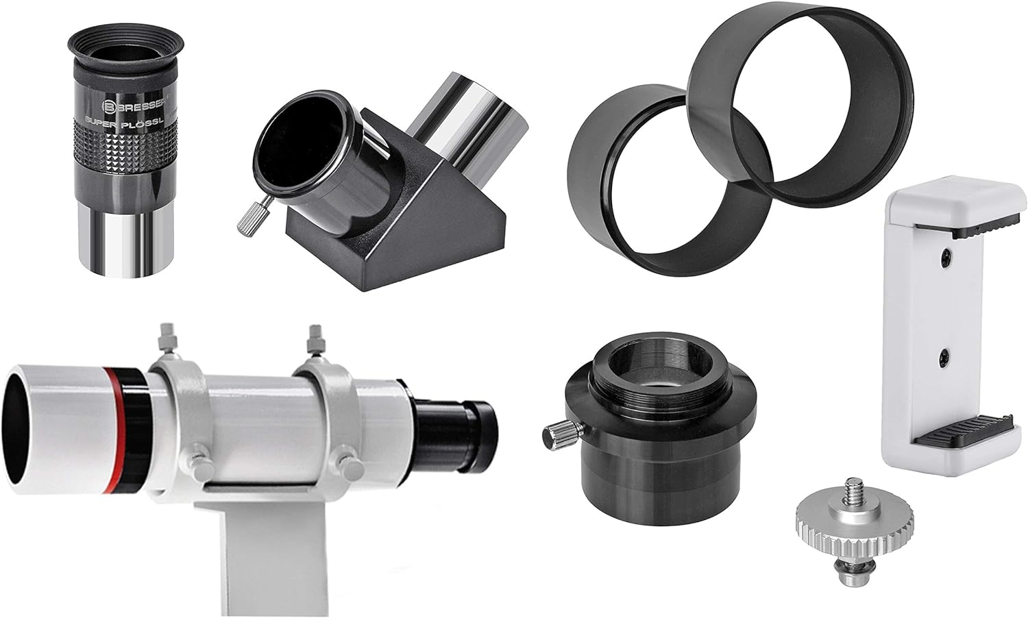 • Lieferumfang:26mm Super Plössl Okular (31,7mm / 1,25"), integrierter 31,7 mm und T2 Adapter, Adapter für 50,8 mm (2") Okulare, Rohrschellen mit Prismenschiene, 6x30 Sucherfernrohr