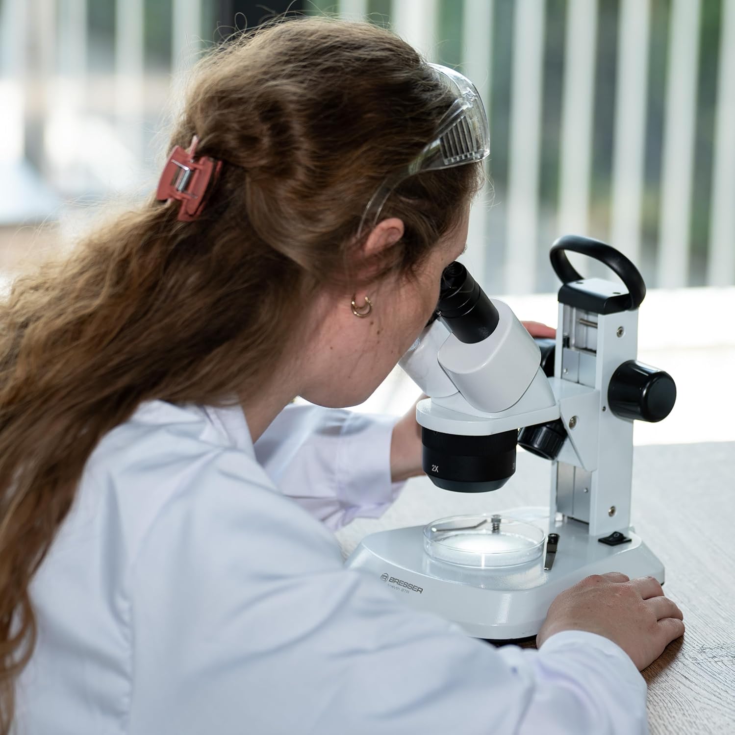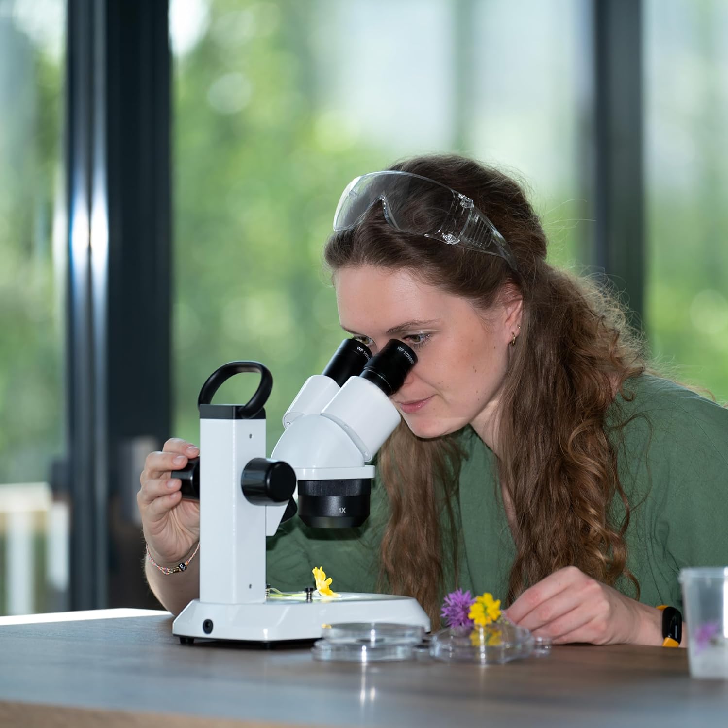 - Stereomikroskop mit 3 Objektivvergrösserungen: 1x; 2x; 4x. Weitfeldokulare mit Augenmuscheln und 20mm Sehfeld