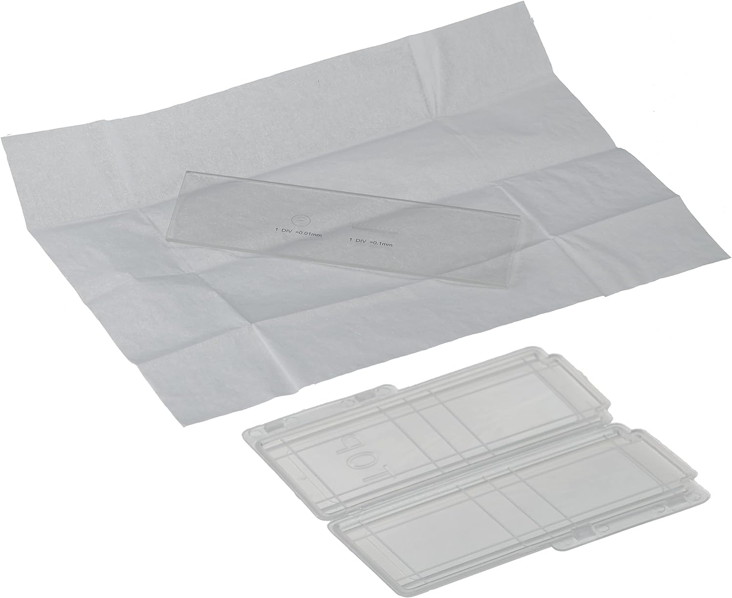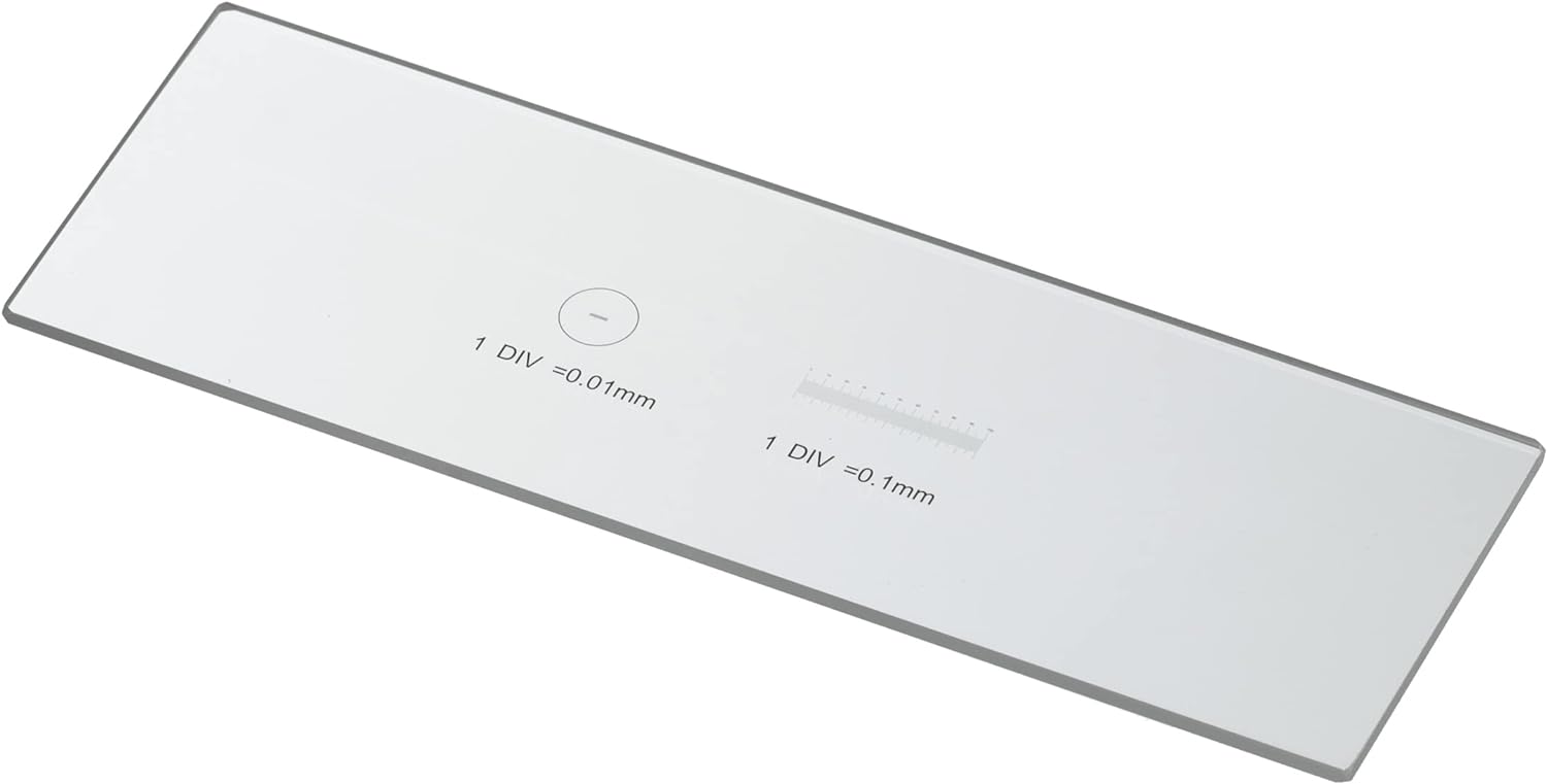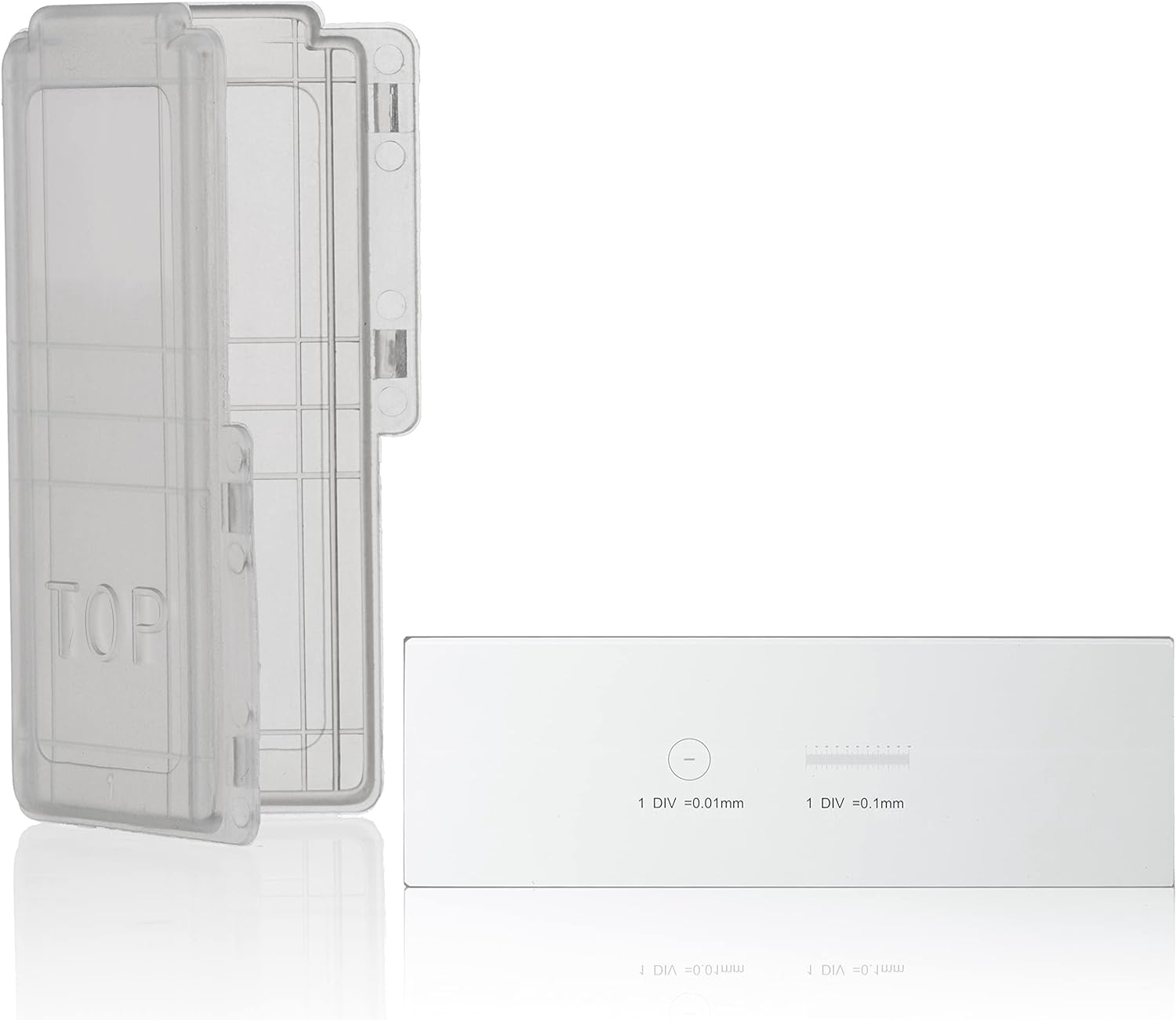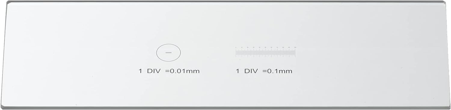 • 2 Skalen auf einem Objektträger. 10 mm Skala mit 100 Teilstrichen (0,1 mm). 1 mm Skala mit 100 Teilstrichen (0,01 mm)