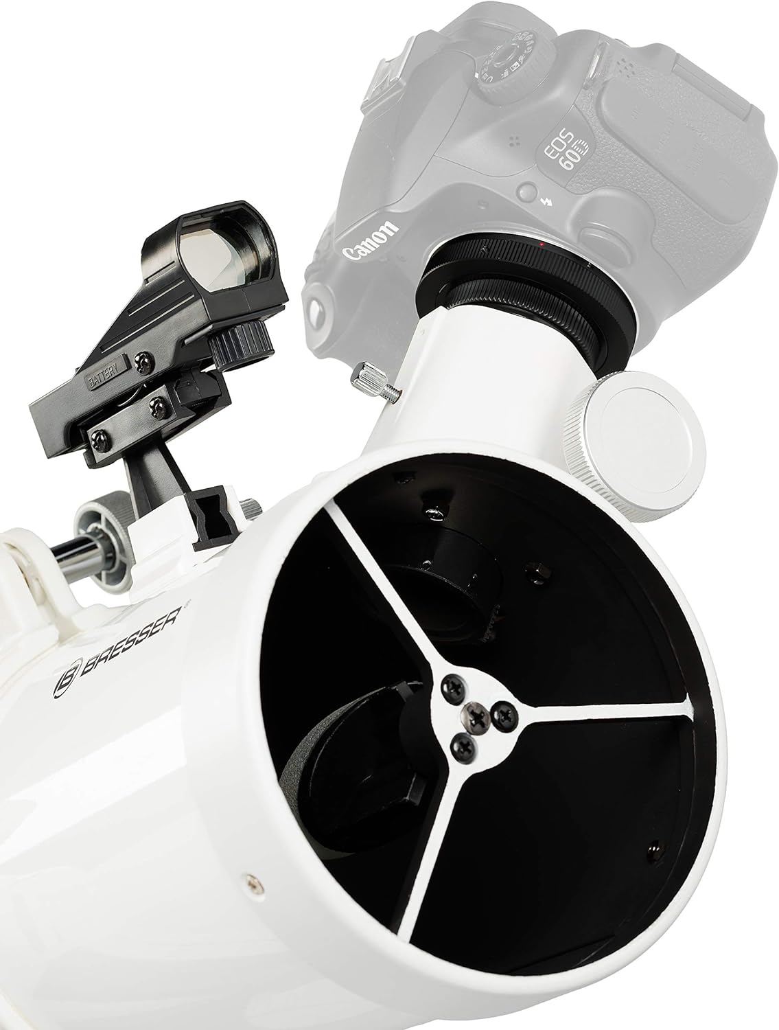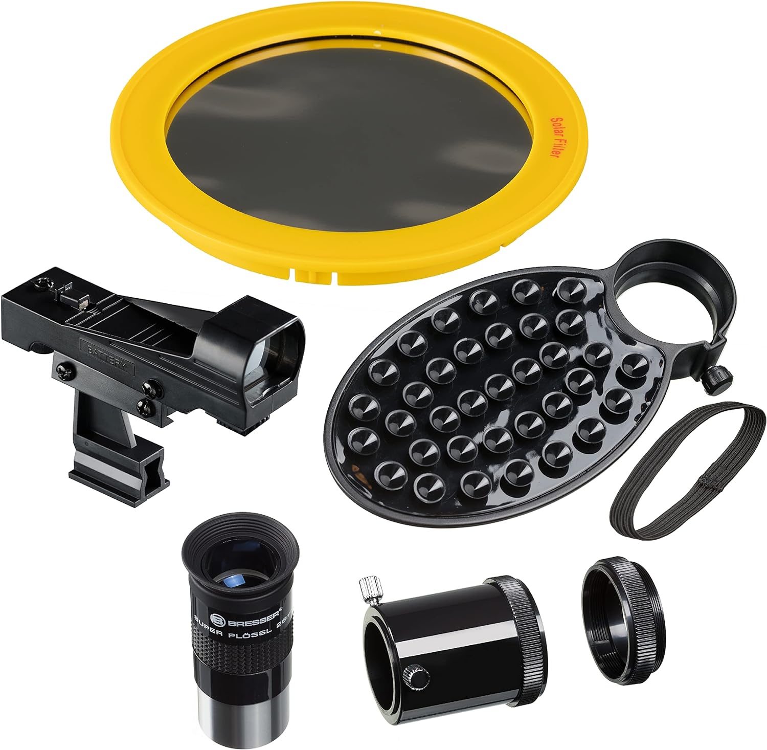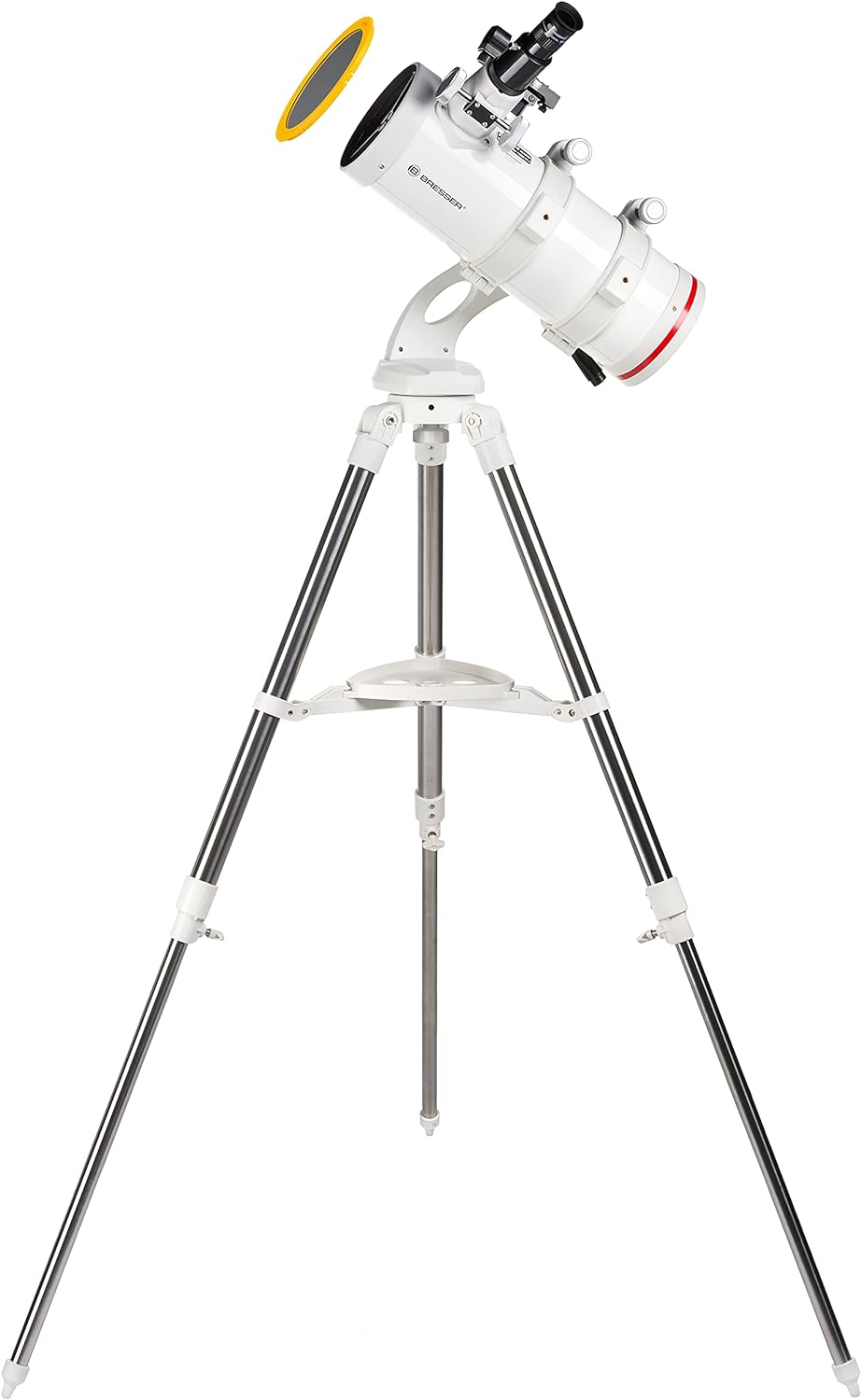- Lieferumfang: Reflektor/Spiegelteleskop; Azimutale NANO Teleskopmontierung; Edelstahl-Stativ mit Zubehör-Ablage; Okular: BRESSER Super Plössl 26mm 1,25" (31,7mm); LED Leuchtpunktsucher; Smartphone Kamera Adapter; Kamera-Adapter Ring T2 (M42x0,75mm);