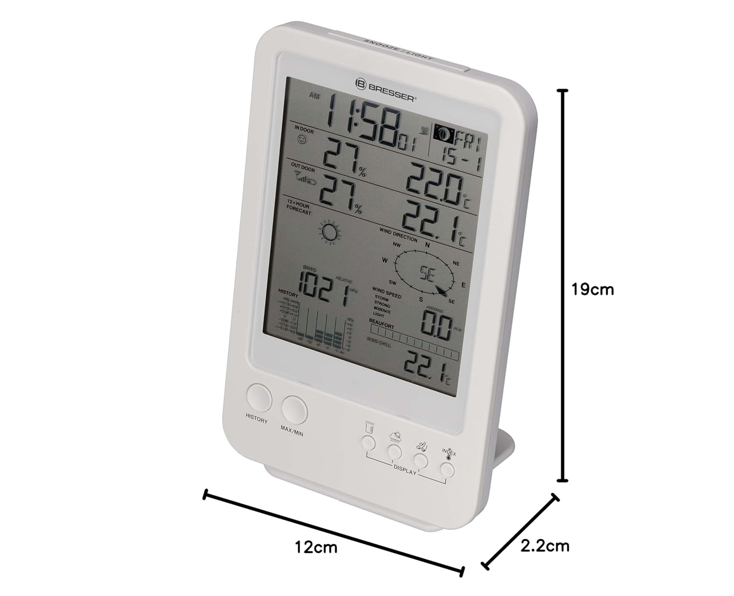 - Die Funkwetterstation 5-in-1 bietet neben Messwerten noch eine Weck-/Alarmfunktion, eine Frost-/Eiswarnung, funkgesteuerte Zeit- und Datumseinstellung (DCF), Anzeige der aktuellen Mondphase und einer 12-Stunden Wettervorhersage