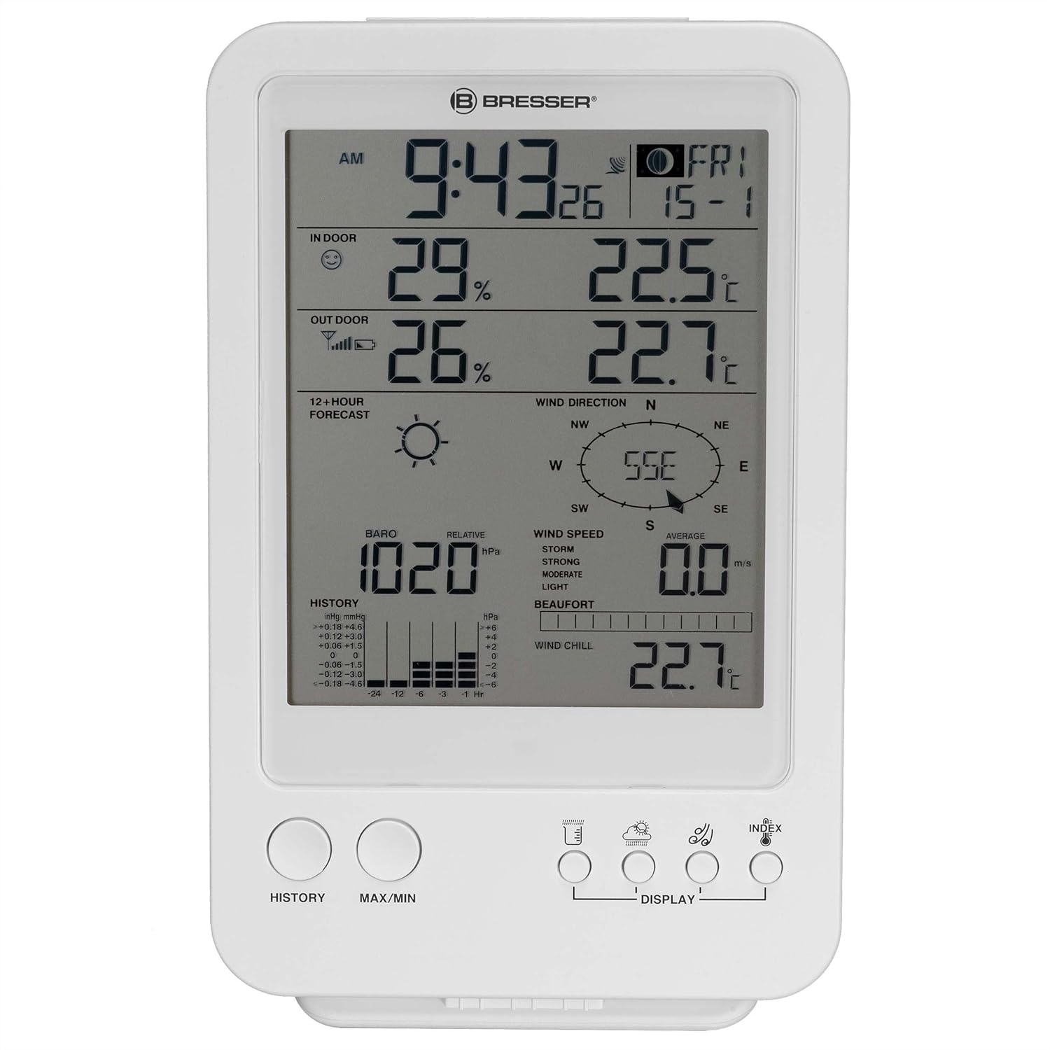 - Der 5-in-1 Aussensensor zeigt Ihnen aktuelle Informationen über die Temperatur, Luftfeuchtigkeit, Luftdruck, Windgeschwindigkeit mit Windrichtung, und Niederschlagsmenge an. Der Speicherfunktion ermöglicht nachträgliches Abrufen früherer Werte der letzten Stunden