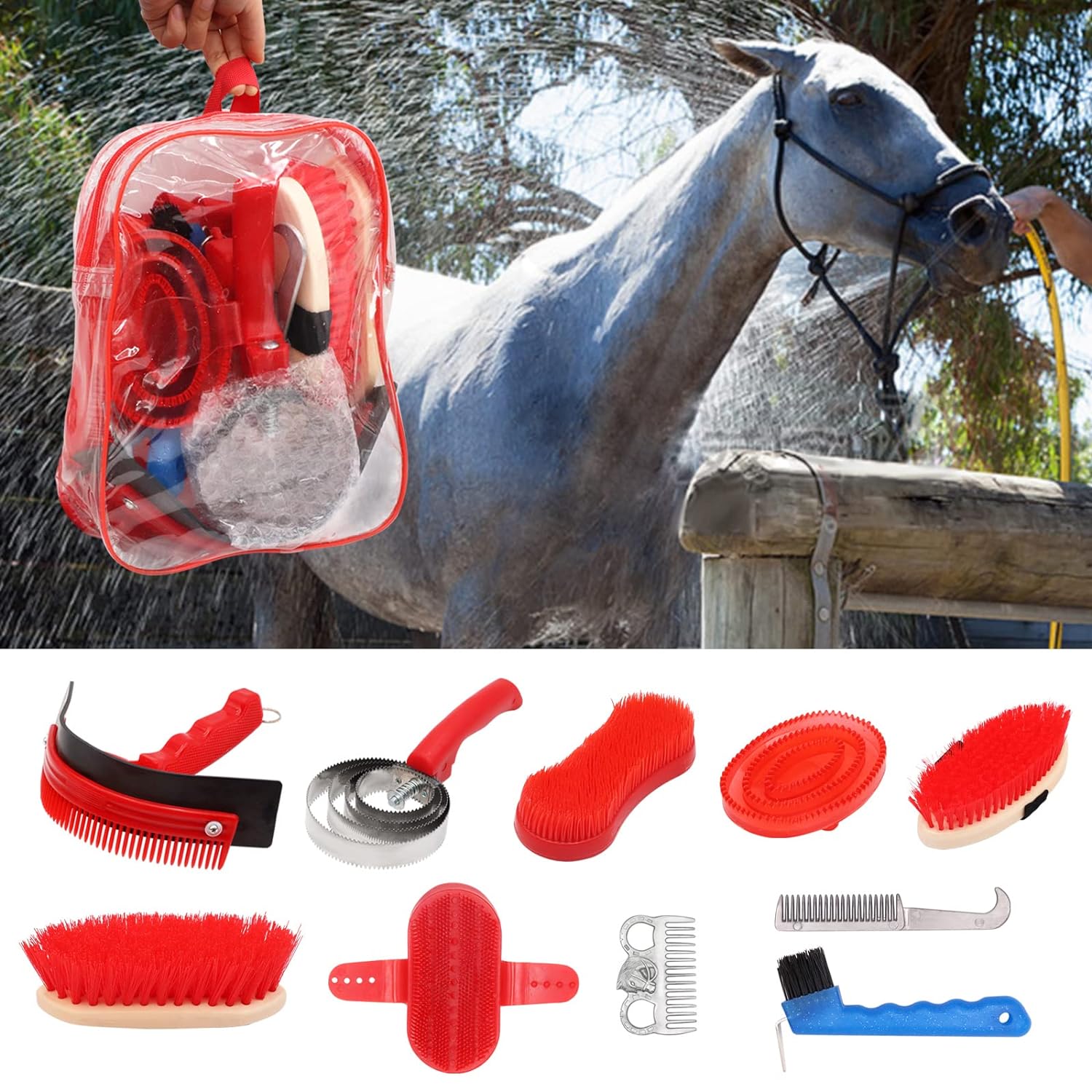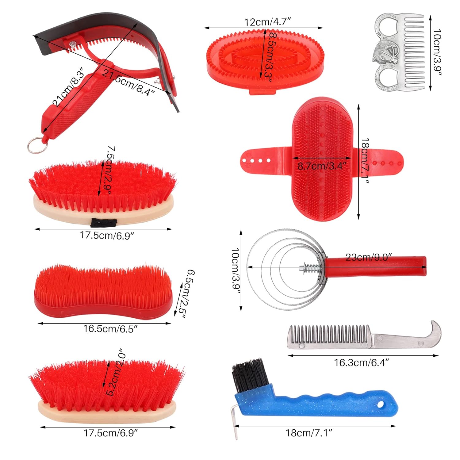 - 🐴 10Pcs Horse Grooming Kit: einschliesslich Schweissschaber, 2 Kämme, Juckreiz, Hufkratzer und 5 Bürsten. Erfüllt die meisten Pferdereinigungsbedürfnisse.