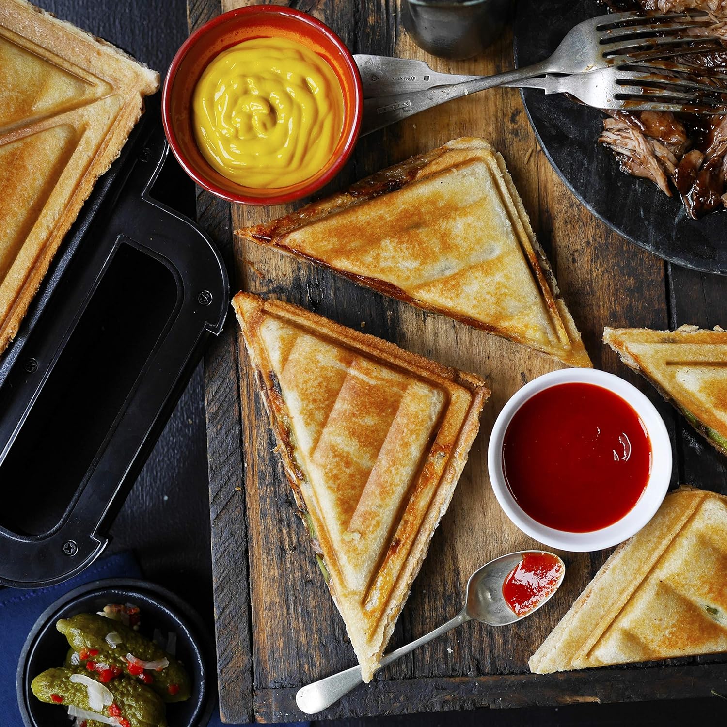 - Vollständig verschlossenes Cut-und-Seal-System: Die dreieckigen Sandwiches werden gleichmässig gebräunt und die Füllung drückt sich nicht heraus