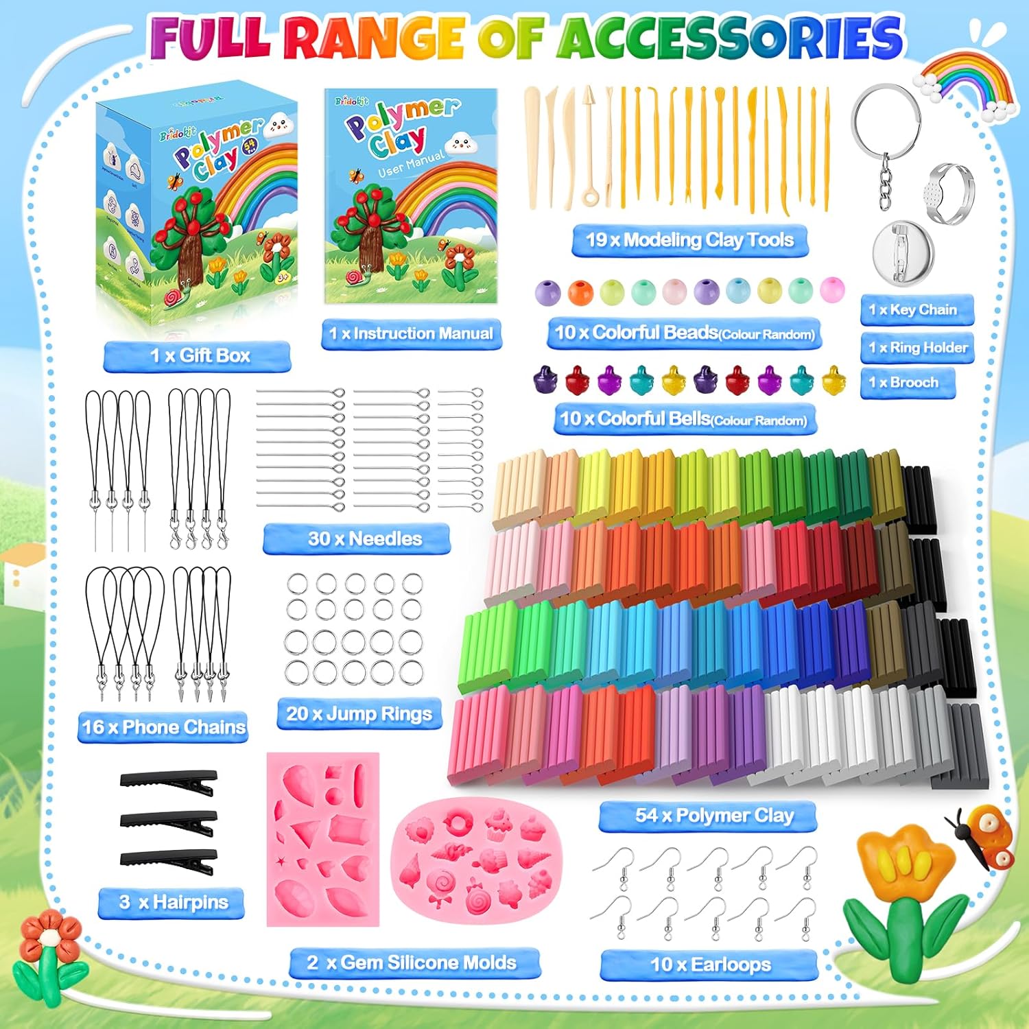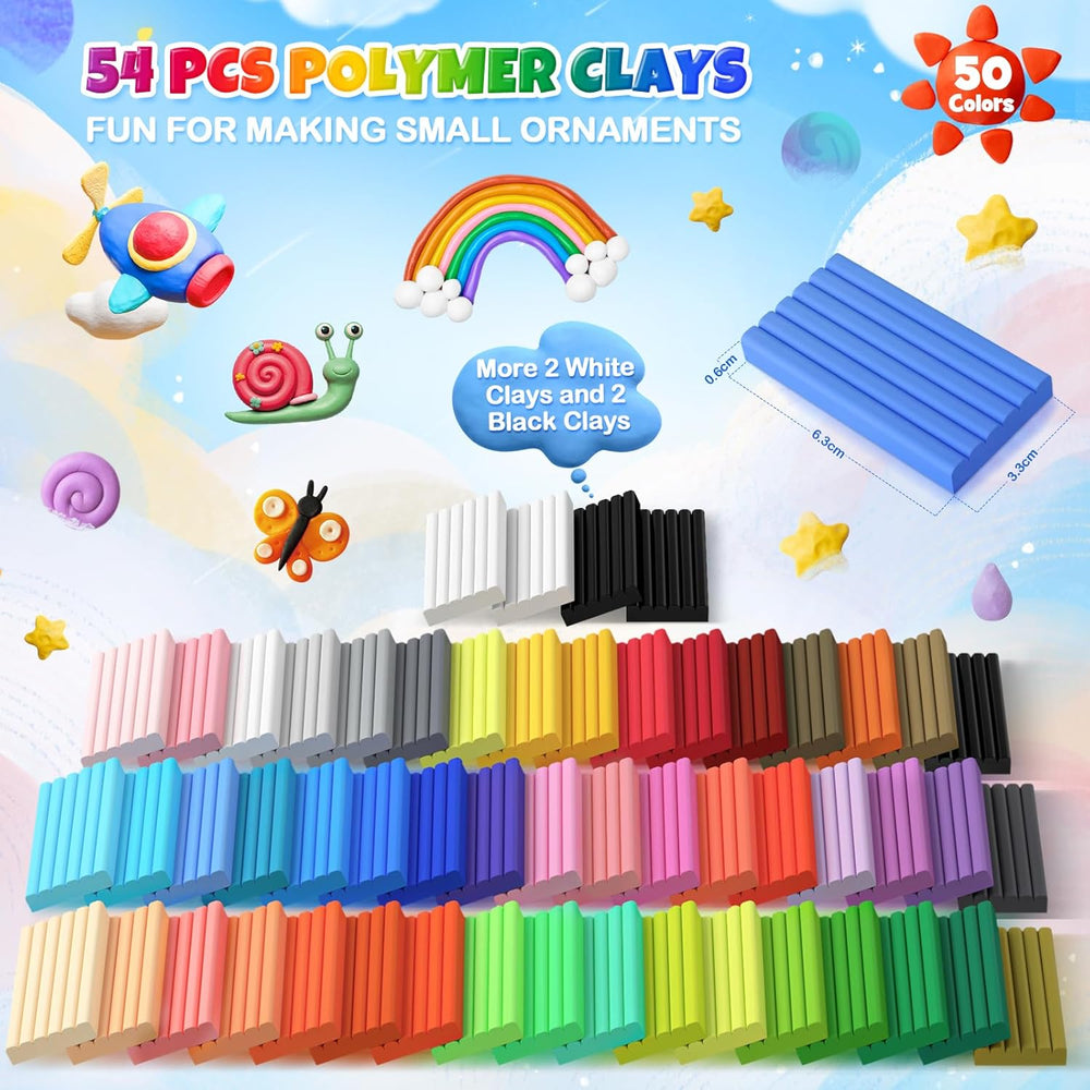 - Vibrant Set: Dieses polymer clay set enthält 54 stück (plus 1 weisser und 1 schwarzer Block als Extra), 2 Formen für Accessoires, 30 Nadeln, 19 Modellierwerkzeuge, 16 Handy-Anhänger, 10 silberne Ohrhaken, 20 Ohrstecker, 10 bunte Glöckchen, 10
