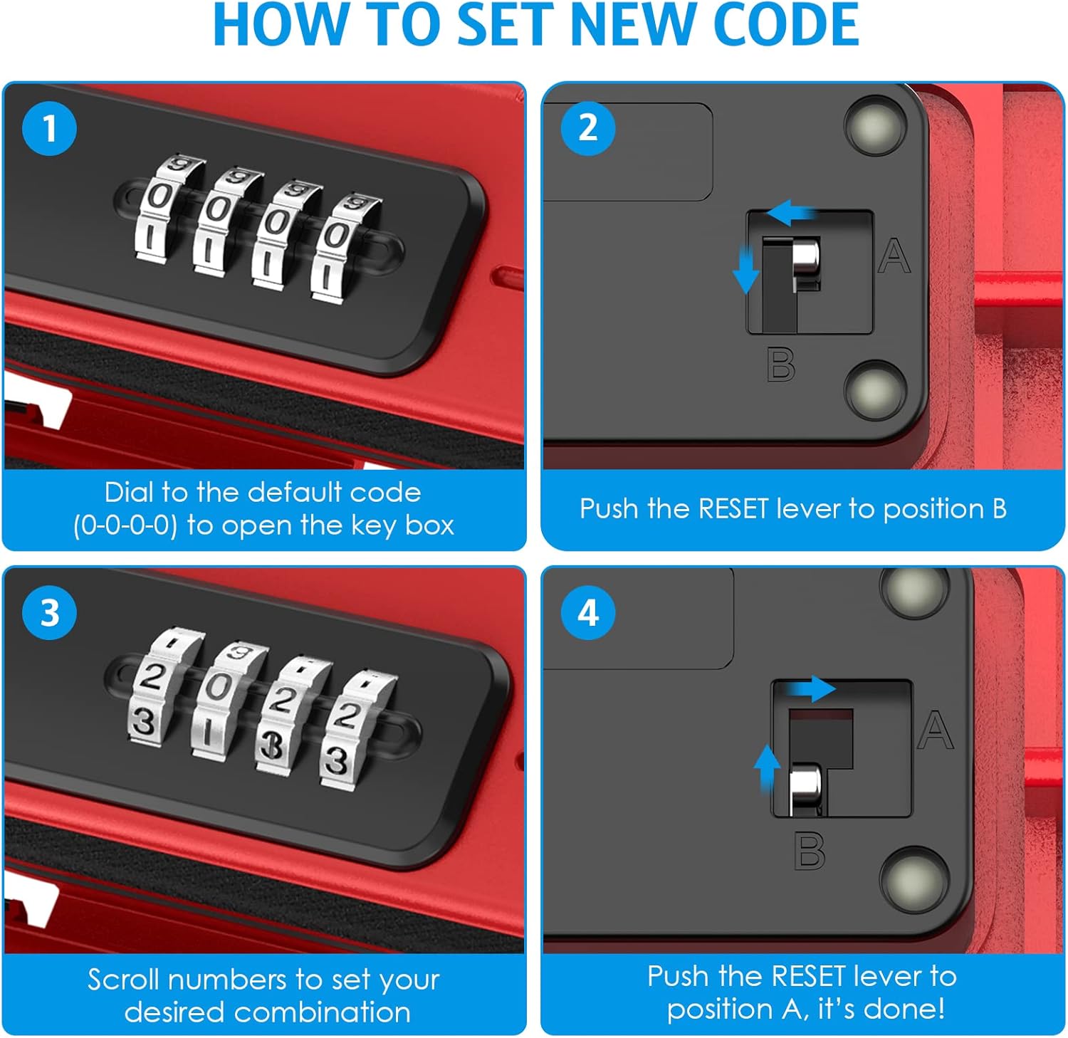 - đă4-stelliger KombinationsschlossăDer RĂŒcksetzbare 4-stellige SchlĂŒsselbox bietet bis zu 10000 Kombinationsmöglichkeiten. Das ist zehnmal sicherer als ein 3-stellige SchlĂŒsselsafe, ist also schwer zu knacken. Es wird empfohlen, ein Foto