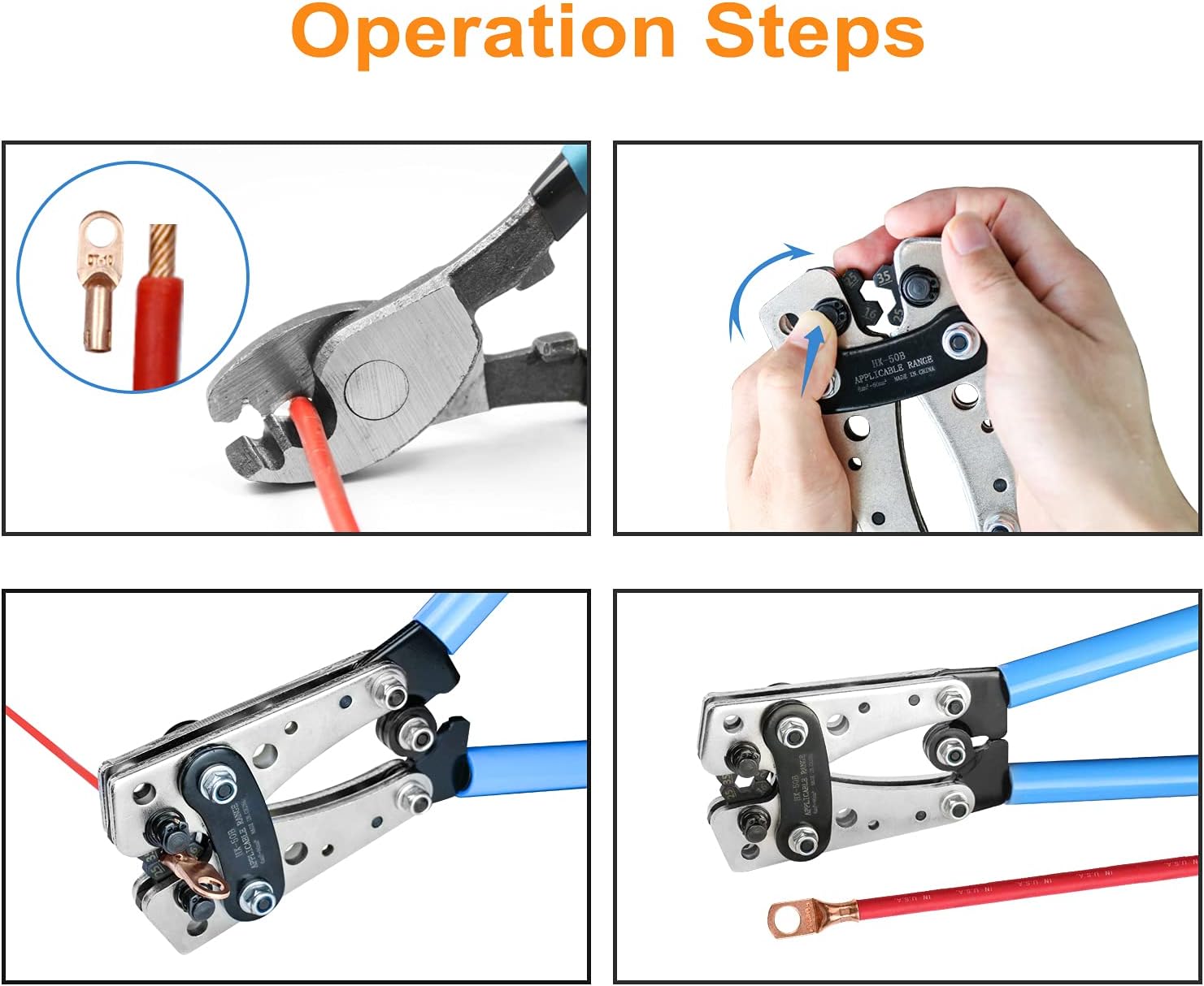 - Die Batterieklemmen-Crimpzange - gebaut in 6 Arten 6mm²/10mm²/16mm²/25mm²/35mm²/50mm² (ähnlich 6 Matrizen von 8, 6, 4, 2, 1, 1/0 AWG) mit rotierenden Köpfen mit einem federbelasteten Sicherungsstift, um die Köpfe zu halten