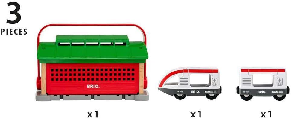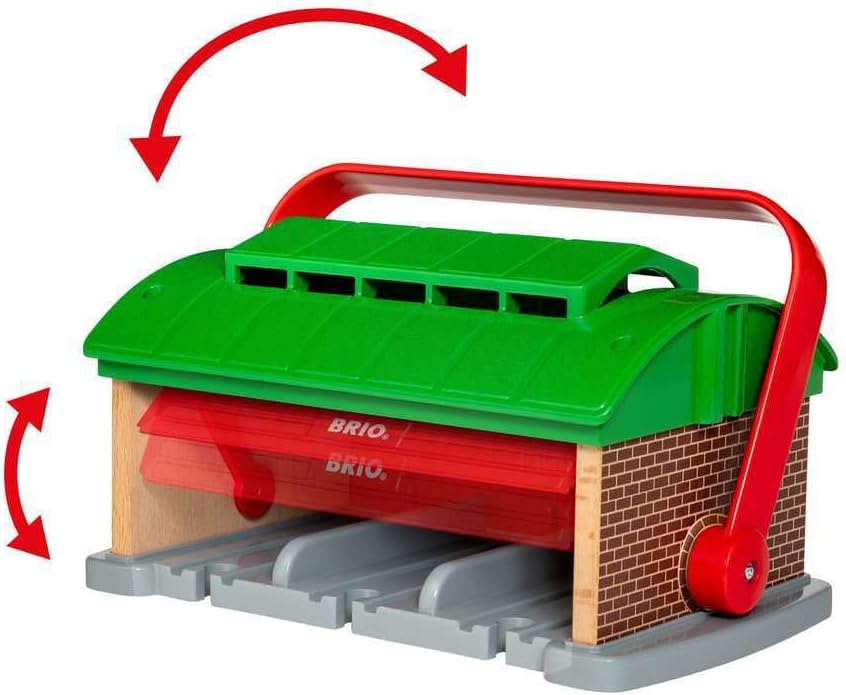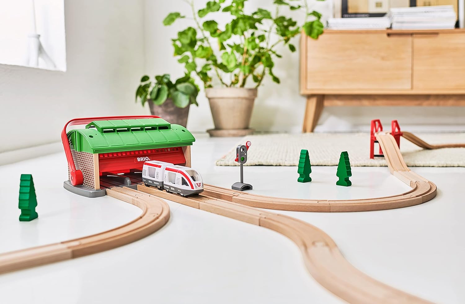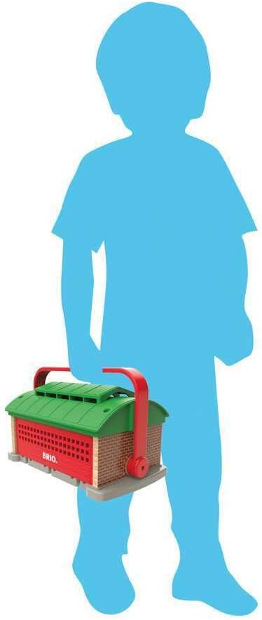 - Lokschuppen mit Platz für drei Spielzeugloks, einem grossen Griff mit Doppelfunktion und BRIO World Reiselok mit Waggon.