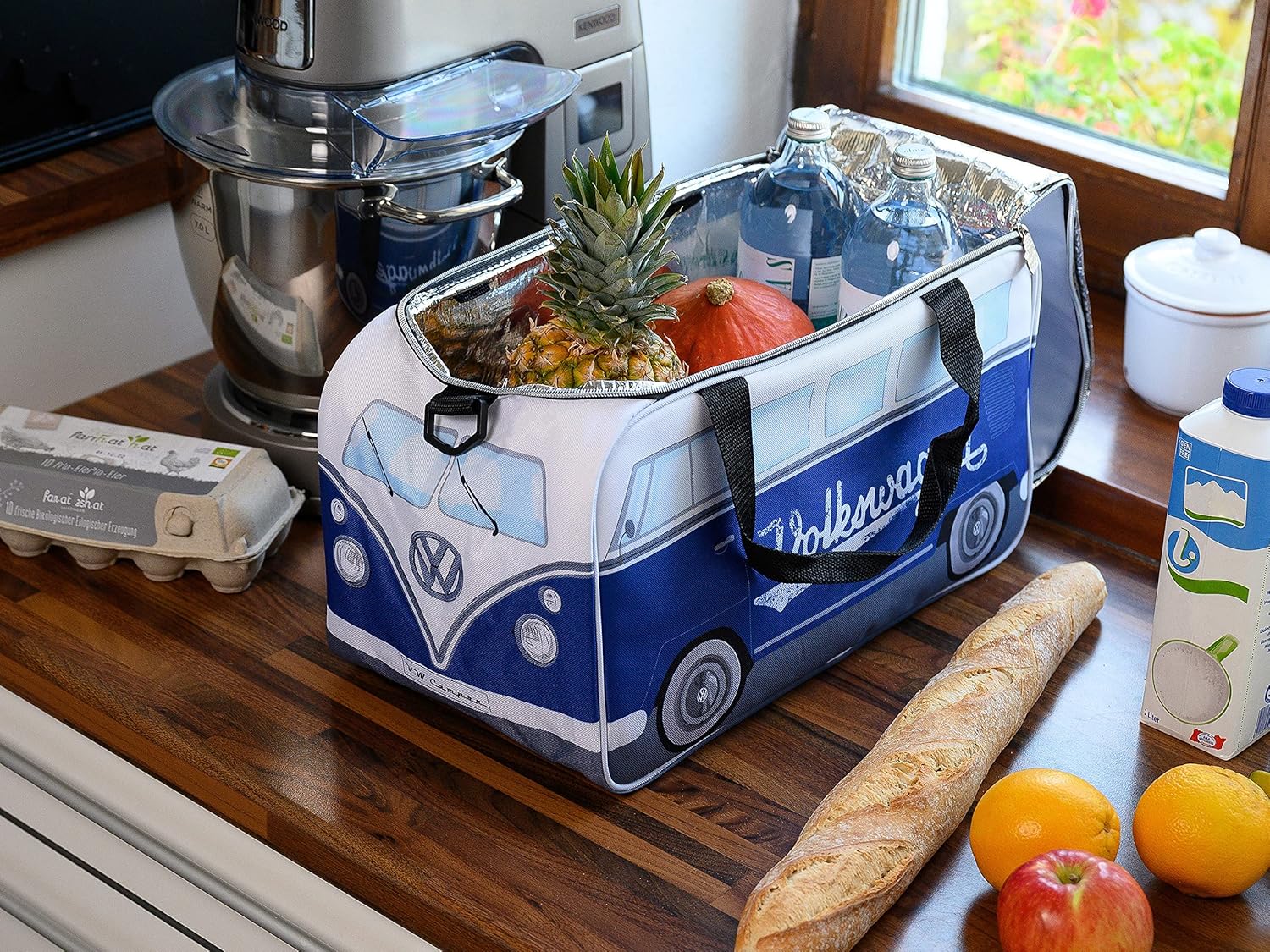 - BLAU & WEISS: diese kultige Kühltasche ist ganz in blau und weiss gehalten, mit dem weissen Schriftzug "Volkswagen" versehen. Ein cooles Detail sind die Zipper Puller in Bus Form: Die Tasche misst 45 x 24 x 25 cm und fasst bis zu 25 Liter.