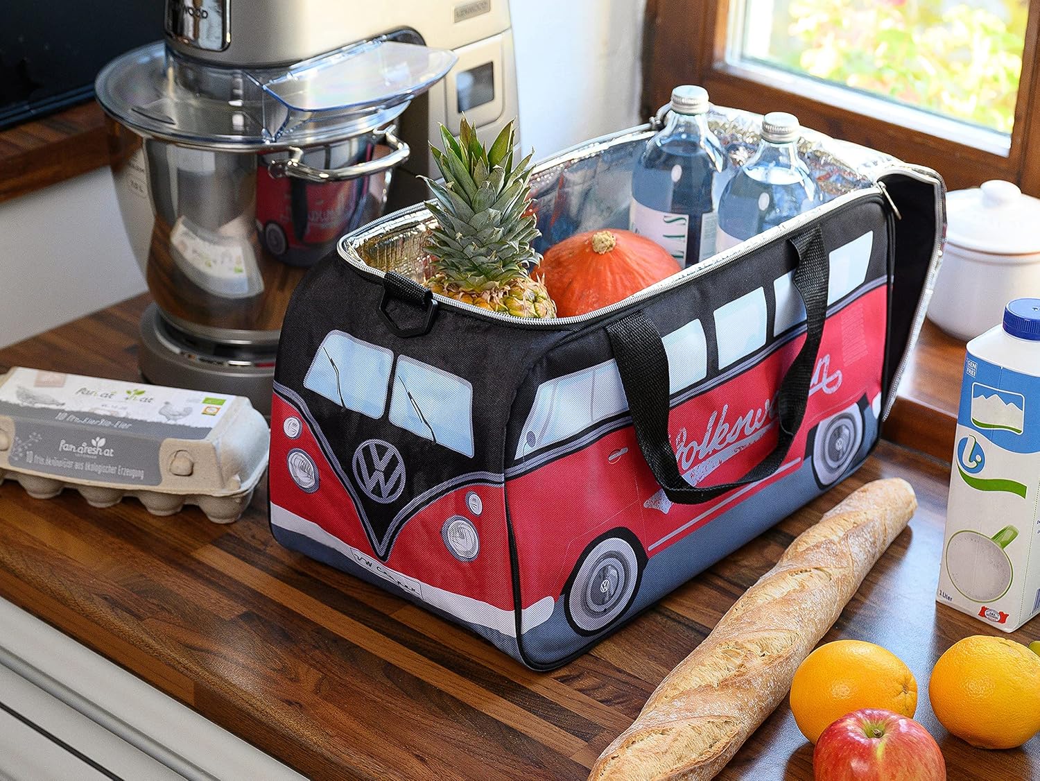 - ROT & SCHWARZ: diese kultige Kühltasche ist ganz in rot und schwarz gehalten, mit dem silbernen Schriftzug "Volkswagen" versehen. Ein cooles Detail sind die Zipper Puller in Bus Form. Die Tasche misst 45 x 24 x 25 cm und fasst bis zu 25 Liter.