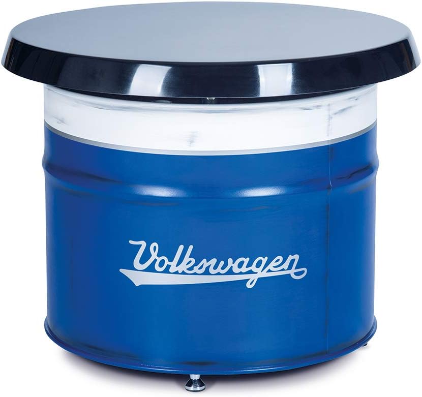 - BUS Weiss & Blau: exklusiver VW T1 Bus Ölfass-Tisch als Unikat in Weiss & Blau, mit dem "Volkswagen" Schriftzug und das VW Logo mit der typischen T1 Bulli 2-Farben Lackierung. Masse: h=58 cm; Ø Tischplatte 70 cm. Gewicht: 17 kg.