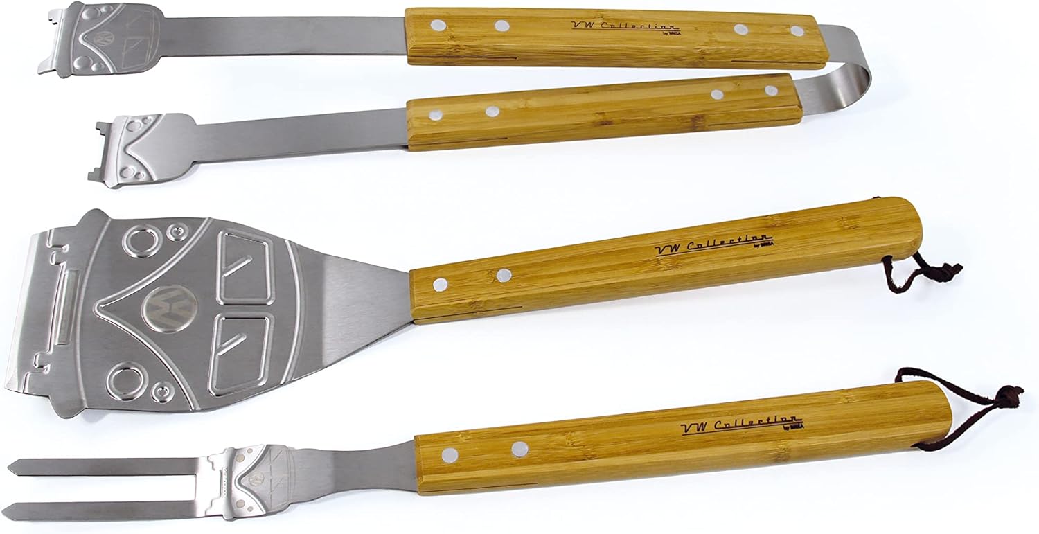 - 🍽 VERBESSERTE Handhabung: Das ohnehin bereits stabile 3-teilige GRILLBESTECK wurde trotz immenser Beliebtheit weiterentwickelt und ist nun noch STABILER. Grillen Sie nun stylischer denn je: im legendären VW T1 Bulli Design. Besonders attraktiv für Grill Enthusiasten, die Wert auf gutes Grill Equipement legen.