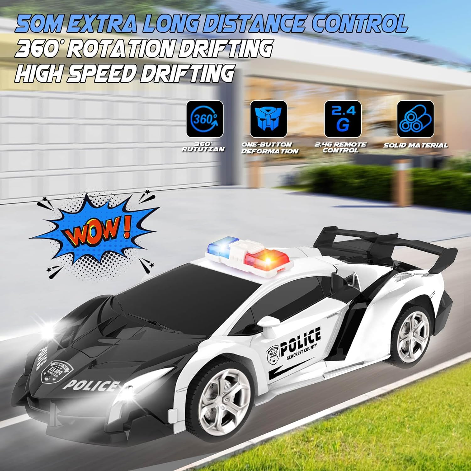 - 360°-DREHUNG UND HOCHGESCHWINDIGKEIT: Mit einem flexiblen Drift-Rad an der Unterseite kann dieses sich Transformator Ferngesteuertes Polizeiauto mühelos 360°-Drehungen zwischen Auto und Roboter modus ausführen. Sein einzigartiges omnidirektionales