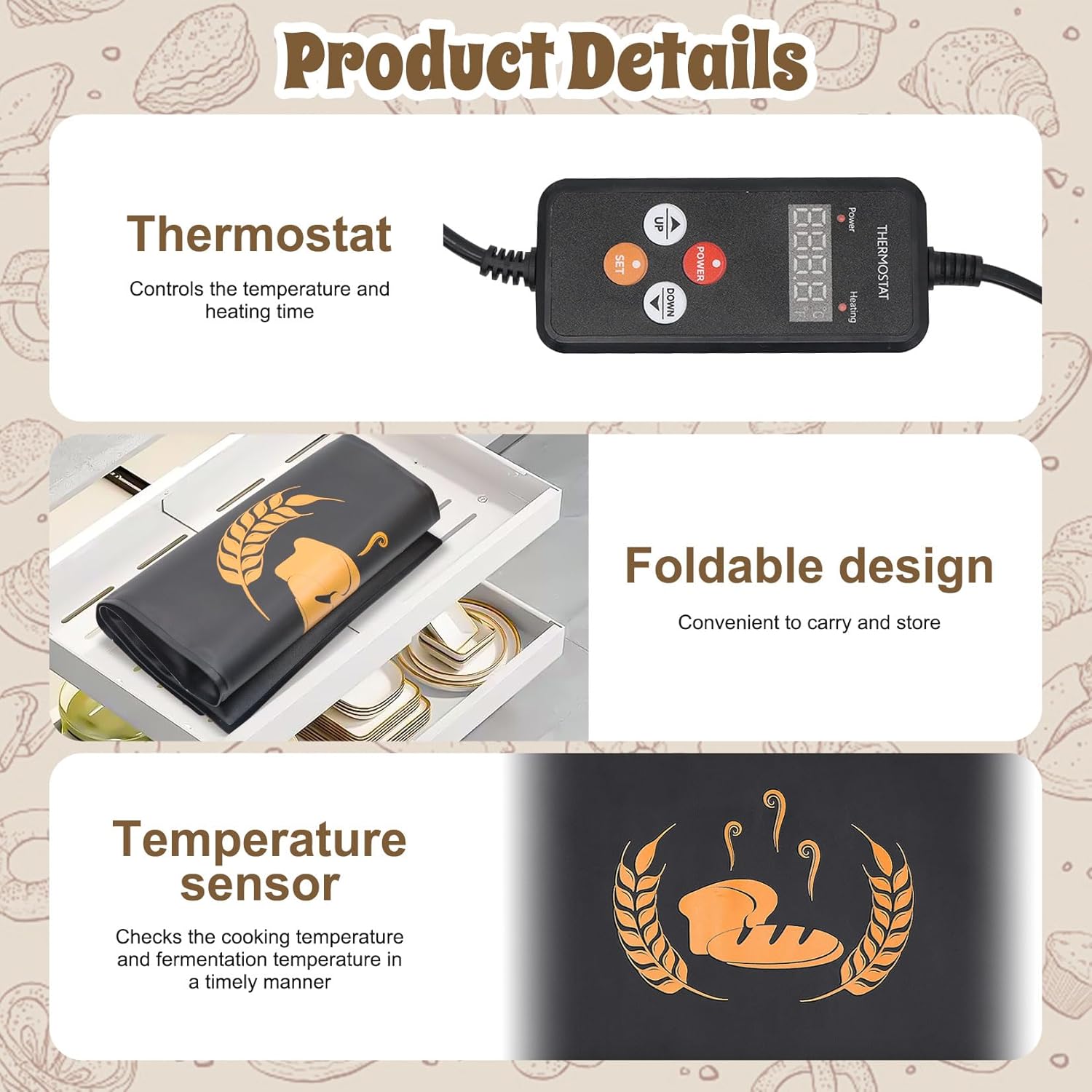 - 🥐Präzise Temperaturüberwachung - Ausgestattet mit einem NTC-Temperatursensor überwacht unsere Heizmatte die tatsächliche Temperatur des Teigs. Dies sorgt dafür, dass die Fermentation immer auf dem optimalen Niveau bleibt und Sie die besten
