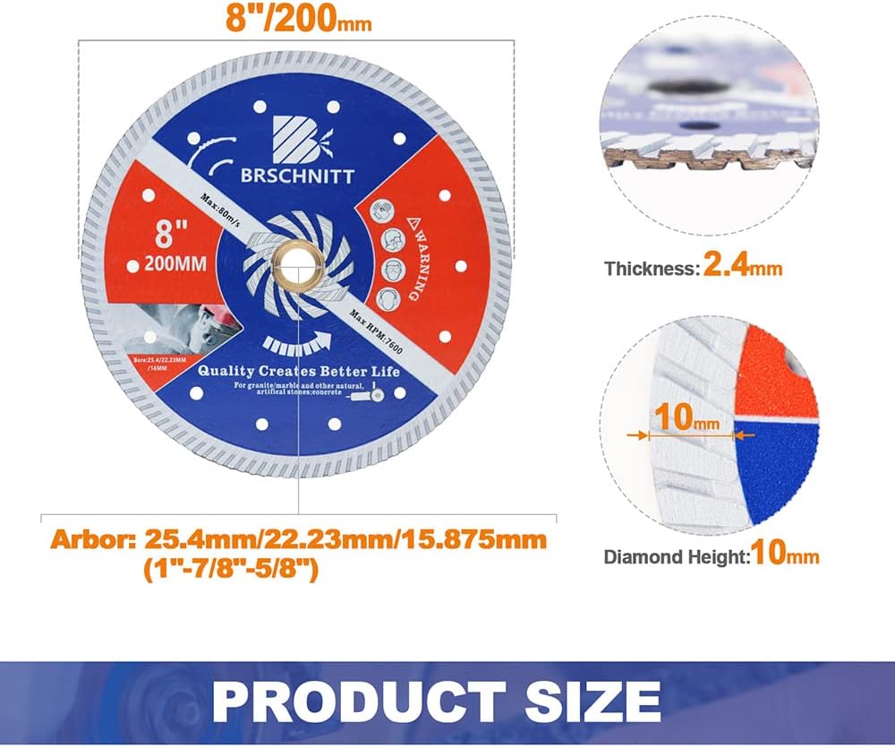 • ✔Grösse -1 Stück 200 mm, Diamanthöhe 10 mm, Segmentdicke 2,4 mm, Dorn 25,4 mm-22,23 mm-16 mm, Nass- oder Trockenschneiden