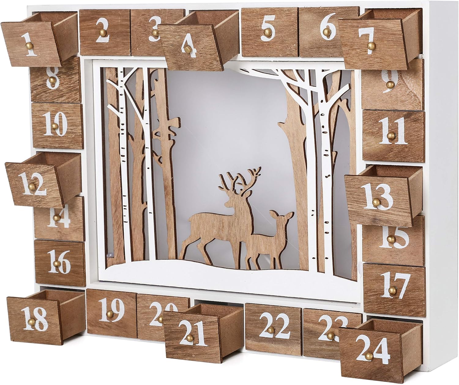 - 🌟 Der strahlend schöne Holzkalender mit LED-Beleuchtung - Entdecken Sie die detailreiche Weihnachtswelt des Kalenders mit seinem Hirsch, dem Reh, seiner zauberhaft verschneiten Winterlandschaft und dem funkelnden Sternenhimmel