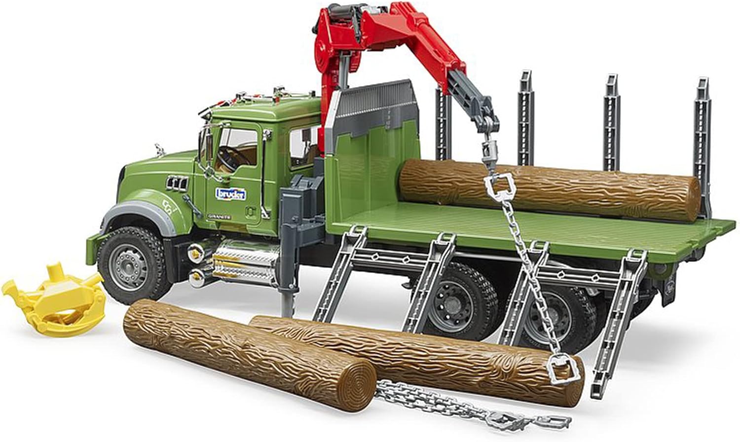 - Der MACK Granite Holztransport-LKW mit Ladekran, Greifer und drei Baumstämmen sorgt für strahlende Augen