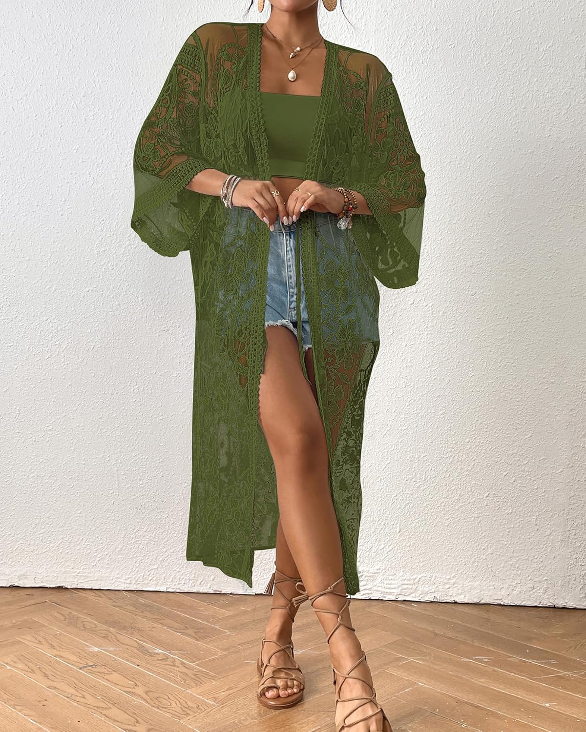 Bsubseach Damen Sexy Lace Crochet Open Front Badeanzug Strand Lange Kimono Cover Ups D-armee Grün, D