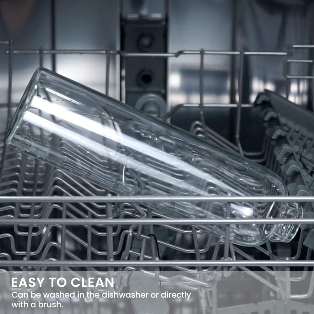 - 【SCHLANKES DESIGN】 Das schlanke Design lässt die Glasflasche stilvoll und elegant wirken. Die durchsichtige Flasche lässt Ihre frisch gepressten Säfte und Smoothies toll aussehen. Sie können es problemlos im Kühlschrank, Küchenschrank,
