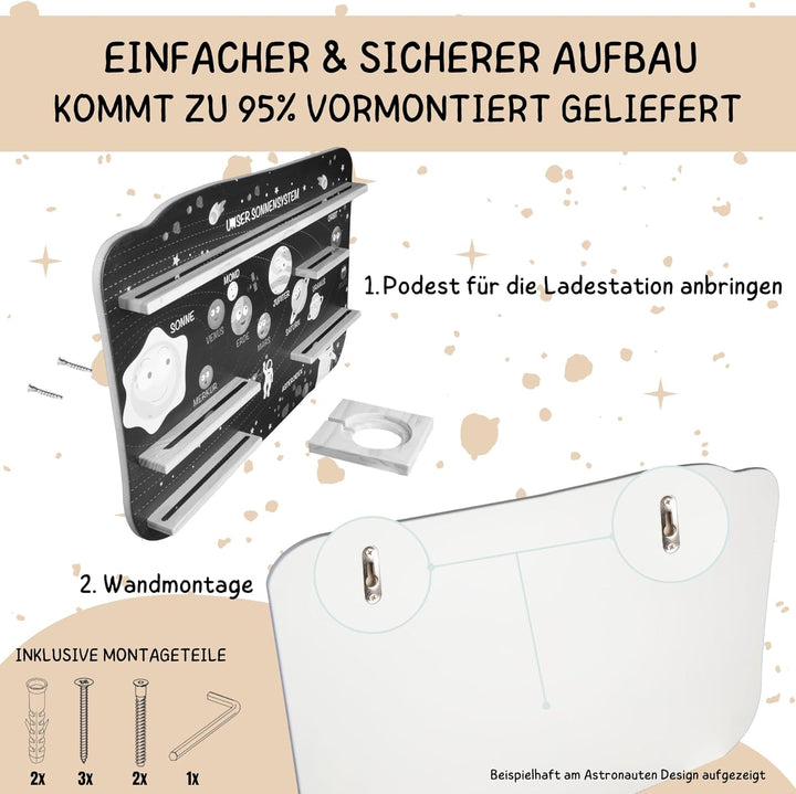 - 🐆 VORMONTIERT GELIEFERT Wir nehmen Ihnen die Arbeit ab. Das Regal Toniebox kommt vormontiert geliefert. Du musst lediglich die Ladestation anbringen und das Brett, mit den mitgelieferten Schrauben und Dübeln, sicher an die Wand montieren.