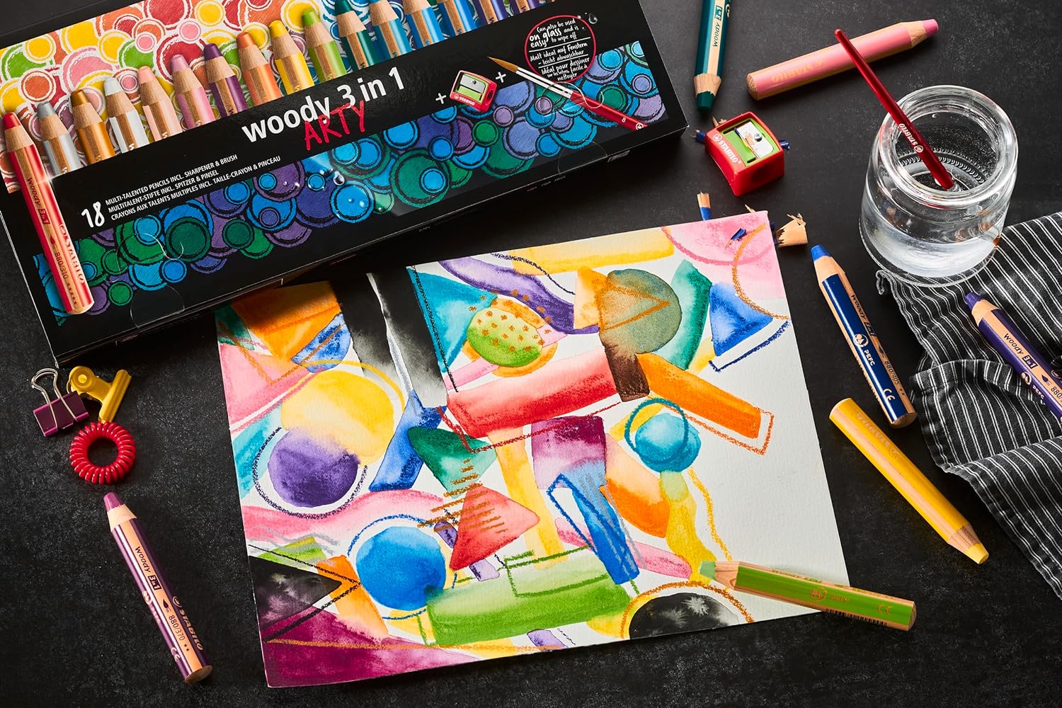 - Buntstift, Wasserfarbe und Wachsmalstift in einem Stift