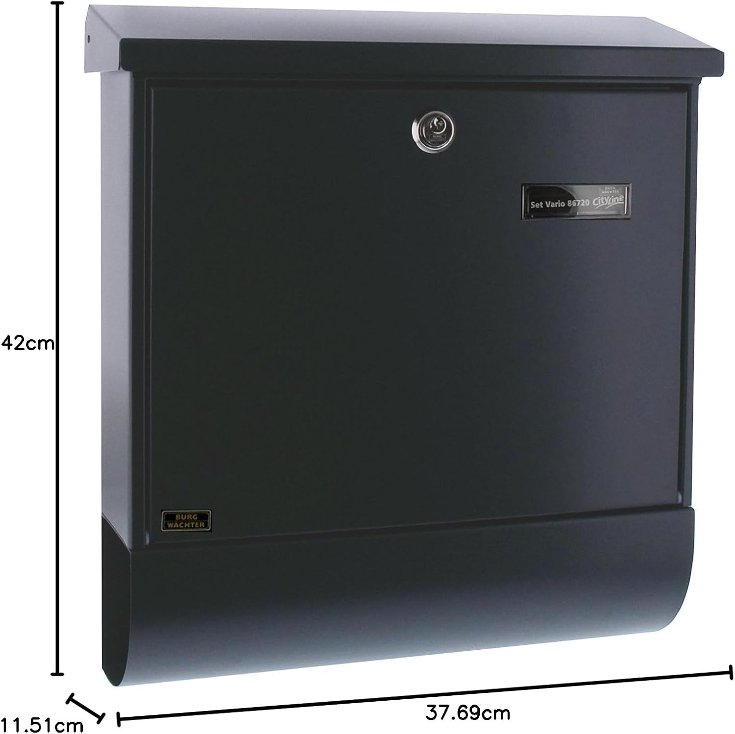 - LIEFERUMFANG & ABMESSUNGEN: 1 BURG-WÄCHTER Postkasten-Set mit Zeitungsfach, Set Vario 86720 ANT, 2 Schlüssel, Abstandshalter und Befestigungsmaterial, Masse inkl. Deckel (HxBxT): 420 x 377 x 115 mm, Einwurf (BxH): 322 x 31 mm, Material: Stahl, Farbe: