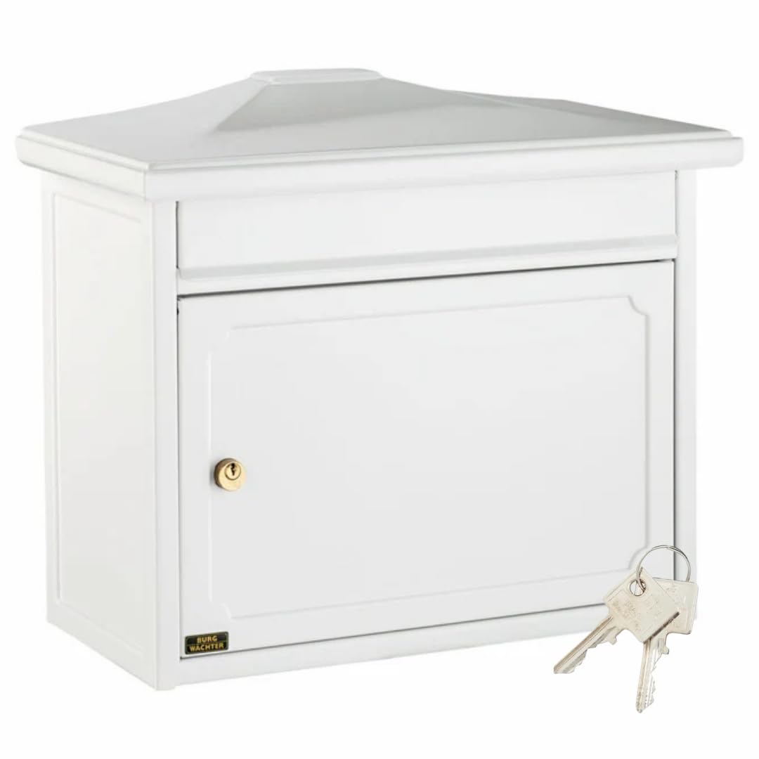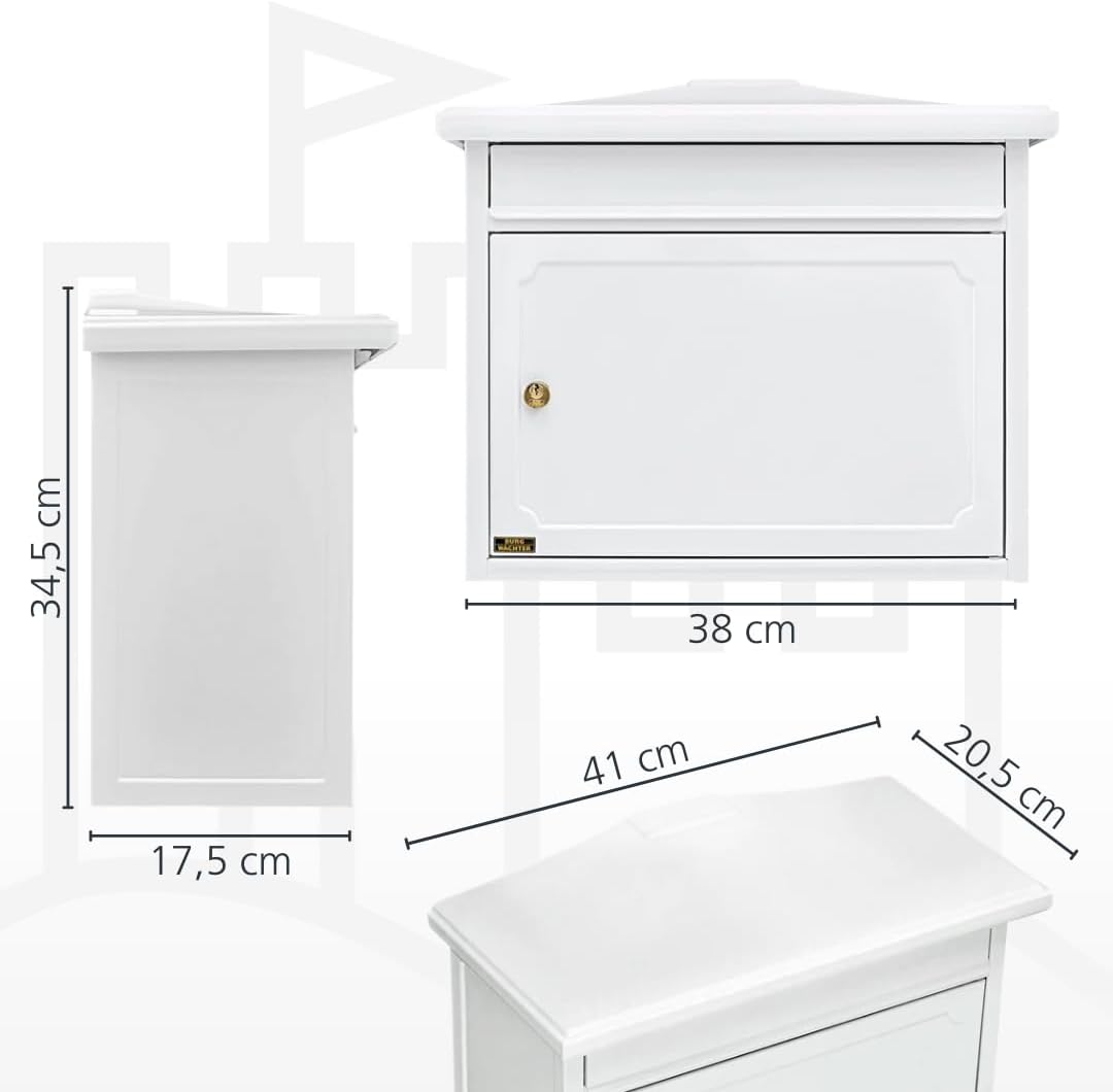- LIEFERUMFANG & ABMESSUNGEN: 1 BURG-WÄCHTER Postkasten, Kopenhagen 882 W, Inkl. 2 Schlüssel, Abstandshalter und Befestigungsmaterial, Masse inkl. Deckel (HxBxT): 345 x 410 x 205 mm, Einwurf (BxH): 330 x 35 mm, Material: verzinkter Stahl, Farbe: Weiss