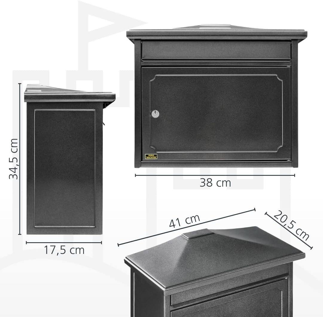 - LIEFERUMFANG & ABMESSUNGEN: 1 BURG-WÄCHTER Postkasten, Kopenhagen 882 W, Inkl. 2 Schlüssel, Abstandshalter und Befestigungsmaterial, Masse inkl. Deckel (HxBxT): 345 x 410 x 205 mm, Einwurf (BxH): 330 x 35 mm, Material: verzinkter Stahl, Farbe: Alteisen