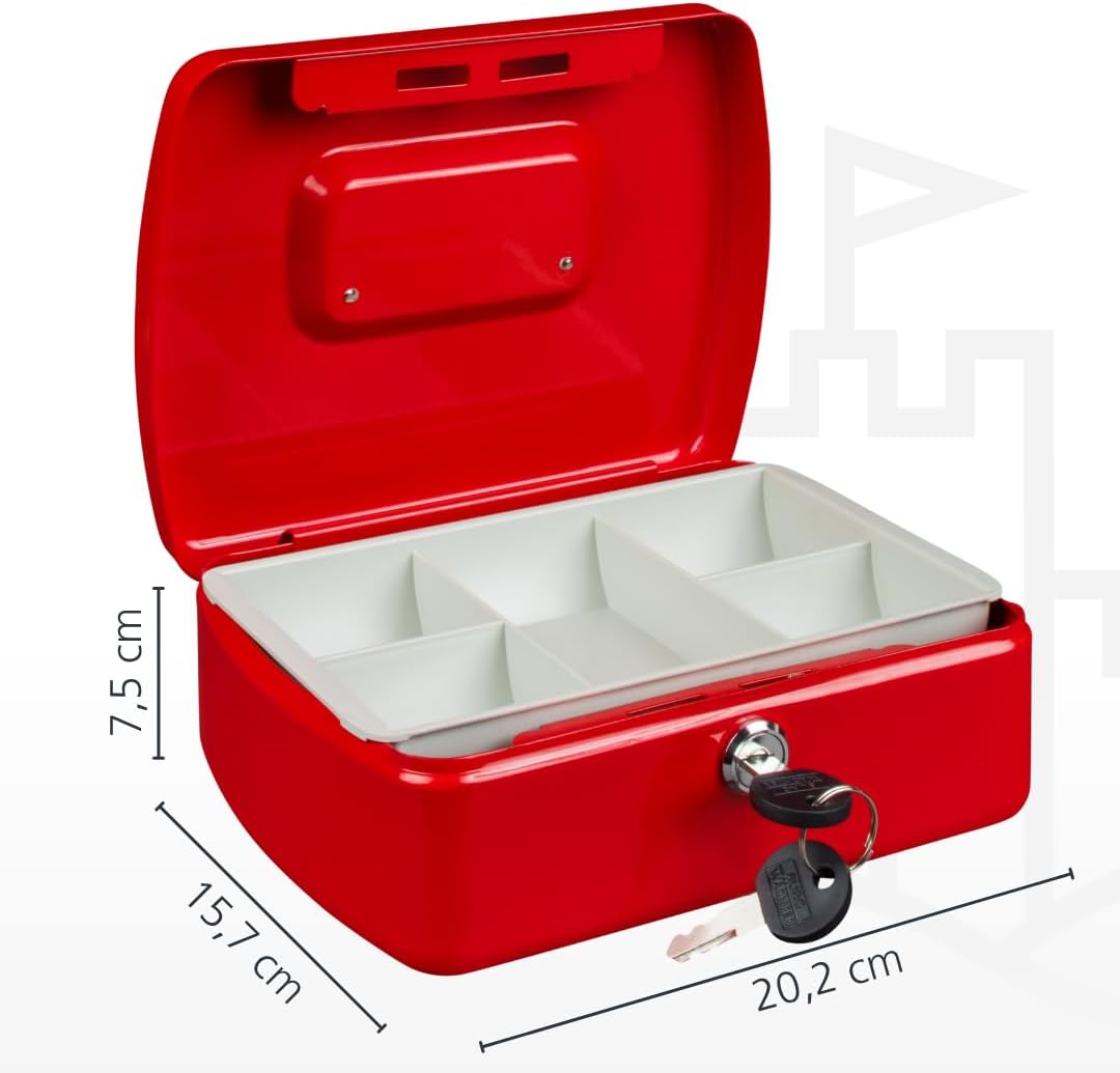 - LIEFERUMFANG & ABMESSUNGEN: 1 BURG-WÄCHTER Geldkassette Office 2207, Hartgeldeinsatz, 2 Schlüssel, Material: Stahlblech, Masse: (HxBxT): 75 x 202 x 157 mm, Farbe: Rot