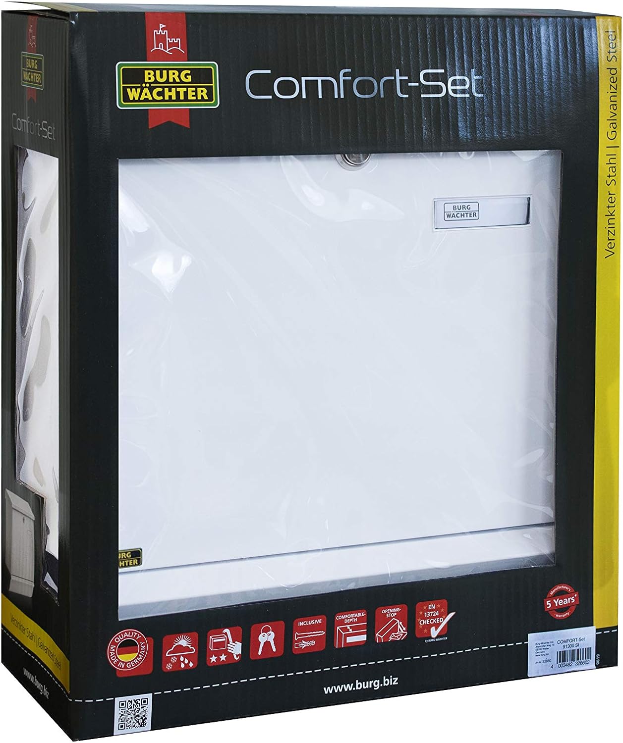 - LIEFERUMFANG & ABMESSUNGEN: 1 BURG-WÄCHTER Postkasten, Comfort-Set 91300 W, 2 Schlüssel, Abstandshalter und Befestigungsmaterial, Masse inkl. Deckel (HxBxT): 44.50 cm x 38.90 cm x 15.80 cm, Einwurf (BxH): 332 x 32 mm, Material: Verzinkter Stahl, Farbe: